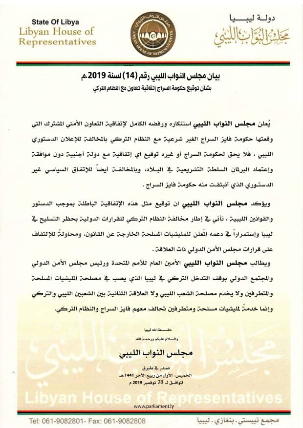 وطالب البرلمان في ختام بيانه الأمين العام للأمم المتحدة ورئيس مجلس الأمن الدولي والمجتمع الدولي بوقف التدخل التركي في ليبيا الذي يصب في مصلحة المليشيات المسلحة والمتطرفين ولا يخدم مصلحة الشعب الليبي ولا العلاقة الثنائية بين الشعبين الليبي والتركي وإنما خدمةلمليشيات مسلحة ومتطرفين تحالف معهم فائز السراج والنظام التركي.