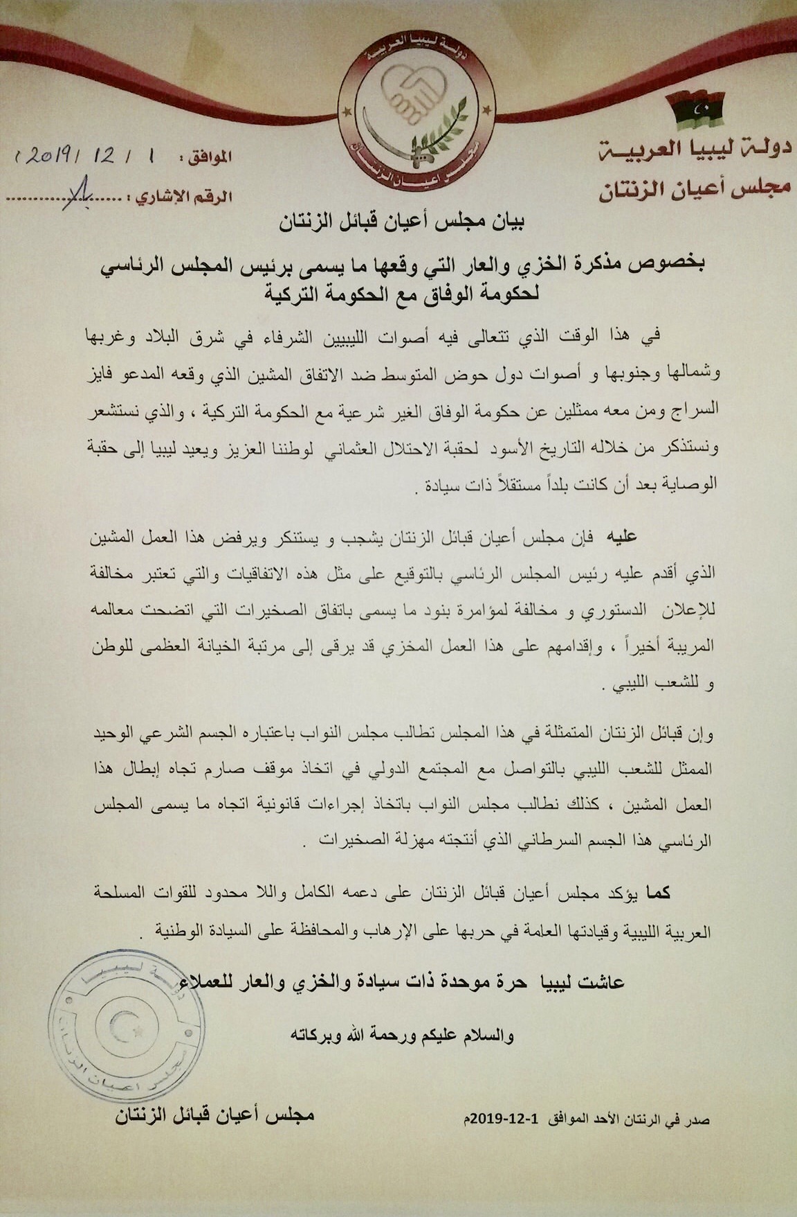 ونوه مجلس أعيان الزنتان في بيان تلقت المرصد نسخة إلى : ” تعالي فيه أصوات الليبيين الشرفاء في شرق البلاد وغربها وشمالها وجنوبها و أصوات دول حوض المتوسط ضد الاتفاق المشين الذي وقعه المدعو فايز السراج ومن معه ممثلين عن حكومة الوفاق الغير شرعية مع الحكومة التركية ” .