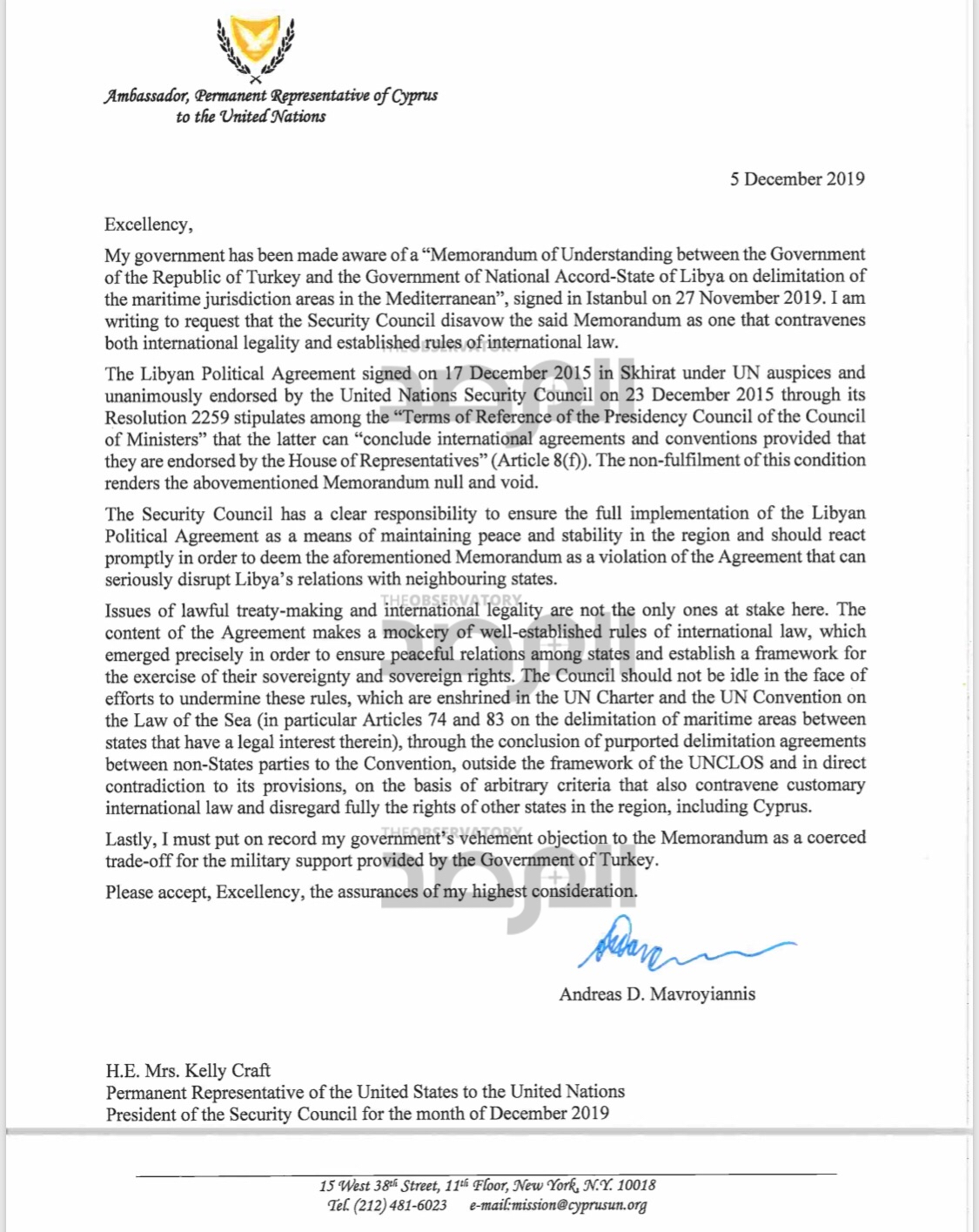 وقالت قبرص التي وجهت الرسالة عبر مندوبها في نيويورك إلى رئيس مجلس الأمن الحالي ، سفير الولايات المتحدة ، متمسكة بعدم أحقية المجلس الرئاسي في توقيع الإتفاقيات وفقًا لنصوص الإتفاق السياسي الذي أنشأ الرئاسي .