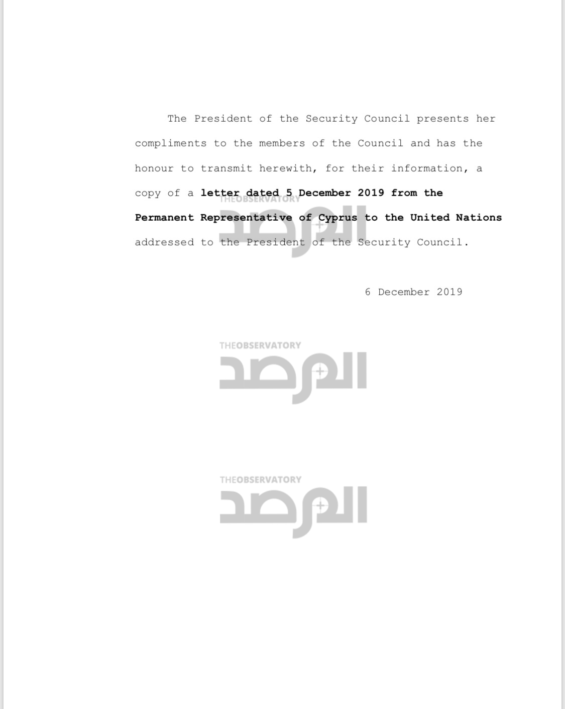 وقالت قبرص التي وجهت الرسالة عبر مندوبها في نيويورك إلى رئيس مجلس الأمن الحالي ، سفير الولايات المتحدة ، متمسكة بعدم أحقية المجلس الرئاسي في توقيع الإتفاقيات وفقًا لنصوص الإتفاق السياسي الذي أنشأ الرئاسي .