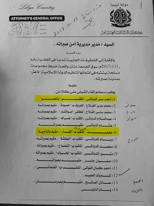 ويعد الفار ضمن المطلوبين جنائيا من قبل النيابة العامة بناء على تعليمات رئيس مكتب التحقيقات بمكتب النائب العام، على ذمة القضية المسلجة في سوق الجمعة بشأن واقعة ضبط مجموعات مسلحة تنتمي لتنظيم داعش بمدينة صبراتة ، وبناء على اعترافات العناصر الداعشية المضبوطة بقضية تنظيم داعش صبراتة، الذين أكدوا أن الفار أحد العناصر المتعاونة مع التنظيم وقدم خدمات لوجستية لهم وقام بتهريبهم وإيواءهم .