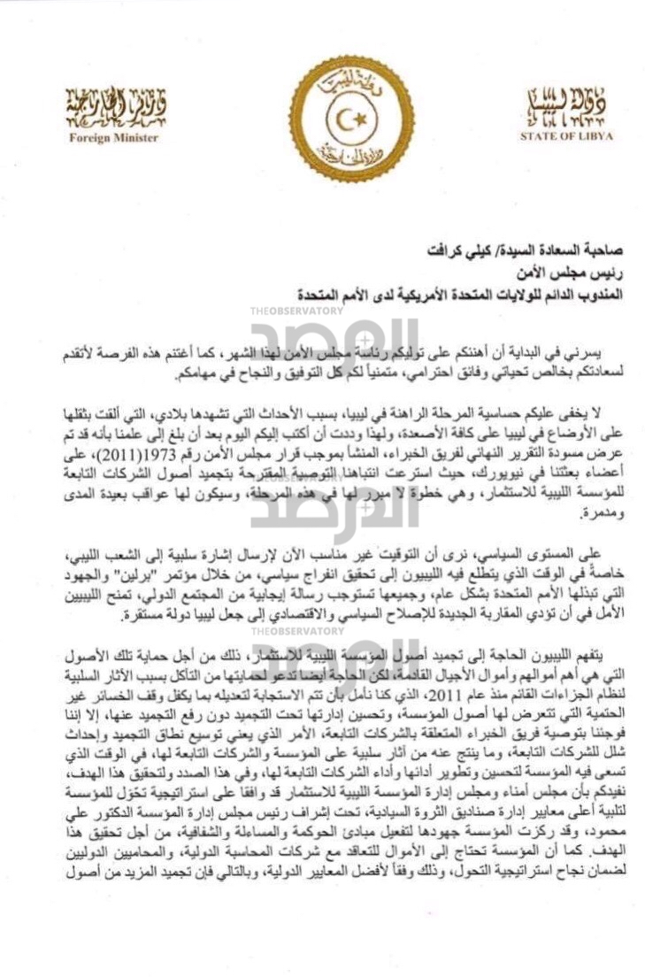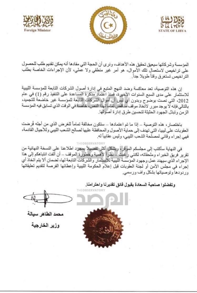 في النهاية سأكتب إلى مجلسكم الموقر، وبشكل أكثر تفصيلاً بمجرد اطلاعنا على النسخة النهائية من تقرير فريق الخبراء وملحقاته، لكنني رغبت – نظراً لأهمية وخطورة الموقف – أن ألفت انتباهكم إلى هذا الإجراء الذي سيهدد عمل وجهود المؤسسة الليبية للاستثمار والشركات التابعة لها، لضمان ألا يتم اتخاذ أي إجراء في مجلس الأمن أو لجنة العقوبات قبل إعلام الحكومة الليبية وإعطائها الفرصة لتقديم تعليقاتها وردودها وتوصياتها بشكل واف ورسمي.