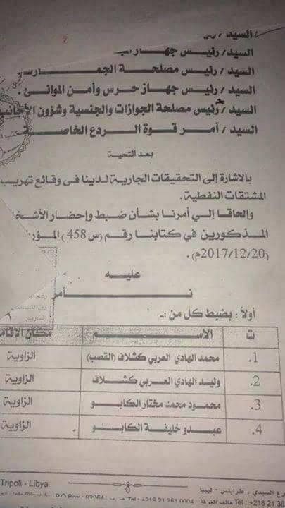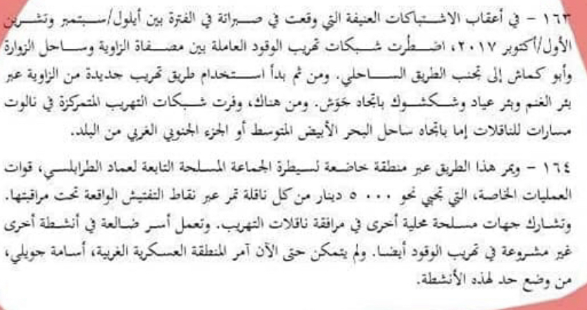 وقد أورد التقرير أن “سرية النصر” التي يتزعمها كشلاف متهمة بالتورط في تهريب الوقود من مصفاة الزاوية وأنها تستخدم “70” زورقا لنقل الوقود المهرب لسفن التهريب، كما أنها سير شاحنات بطريقة غير شرعية إلى زوارة الواقعة إلى الغرب من الزاوية والقريبة من الحدود الليبية التونسية.