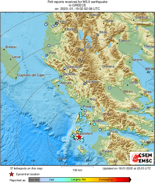 اليونان – أعلن المركز الأورومتوسطي لرصد الزلازل اليوم الأحد 19 يناير/كانون الثاني عن وقوع زلزال بلغت قوته 5.0 قبالة الساحل الشرقي لليونان.