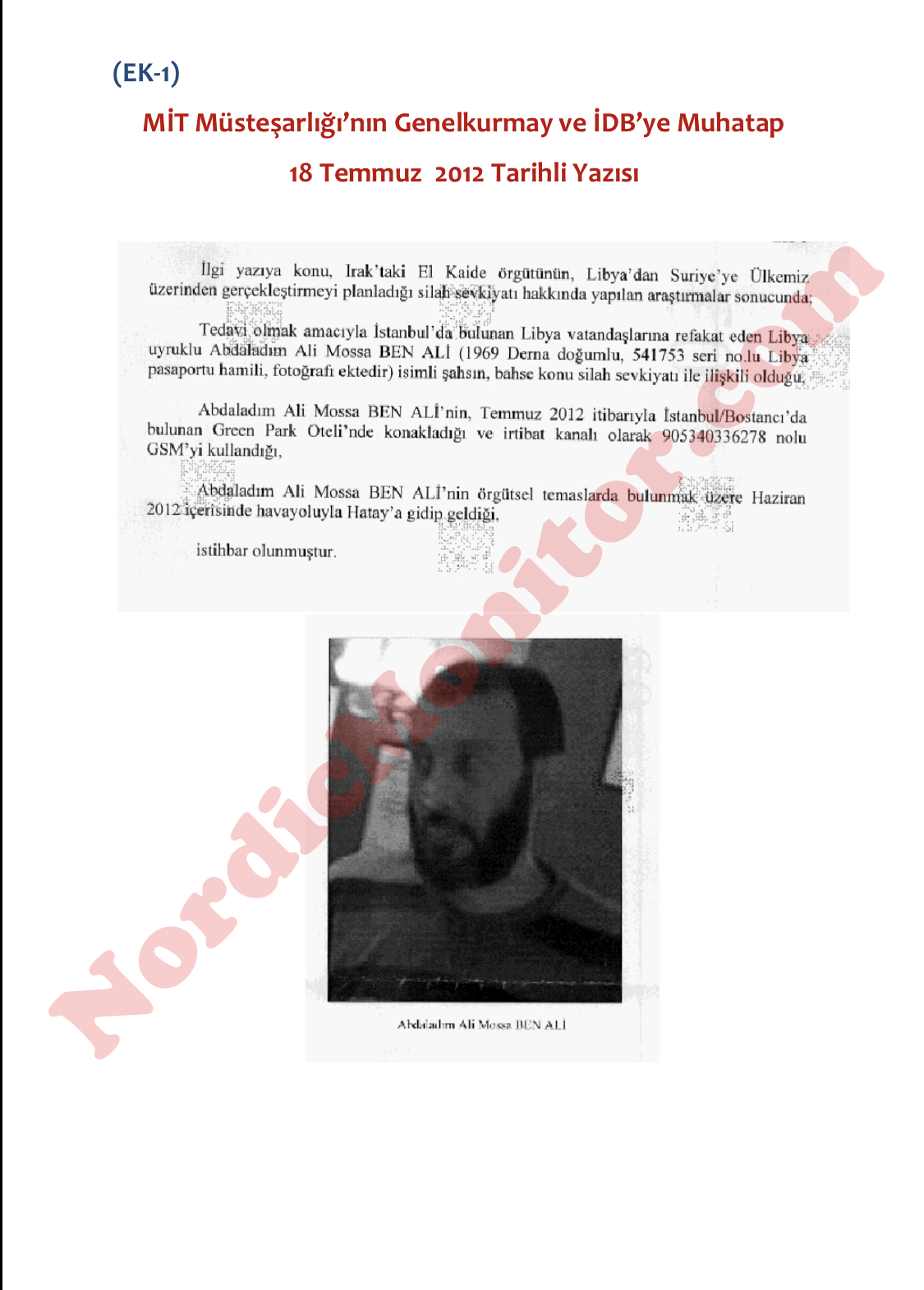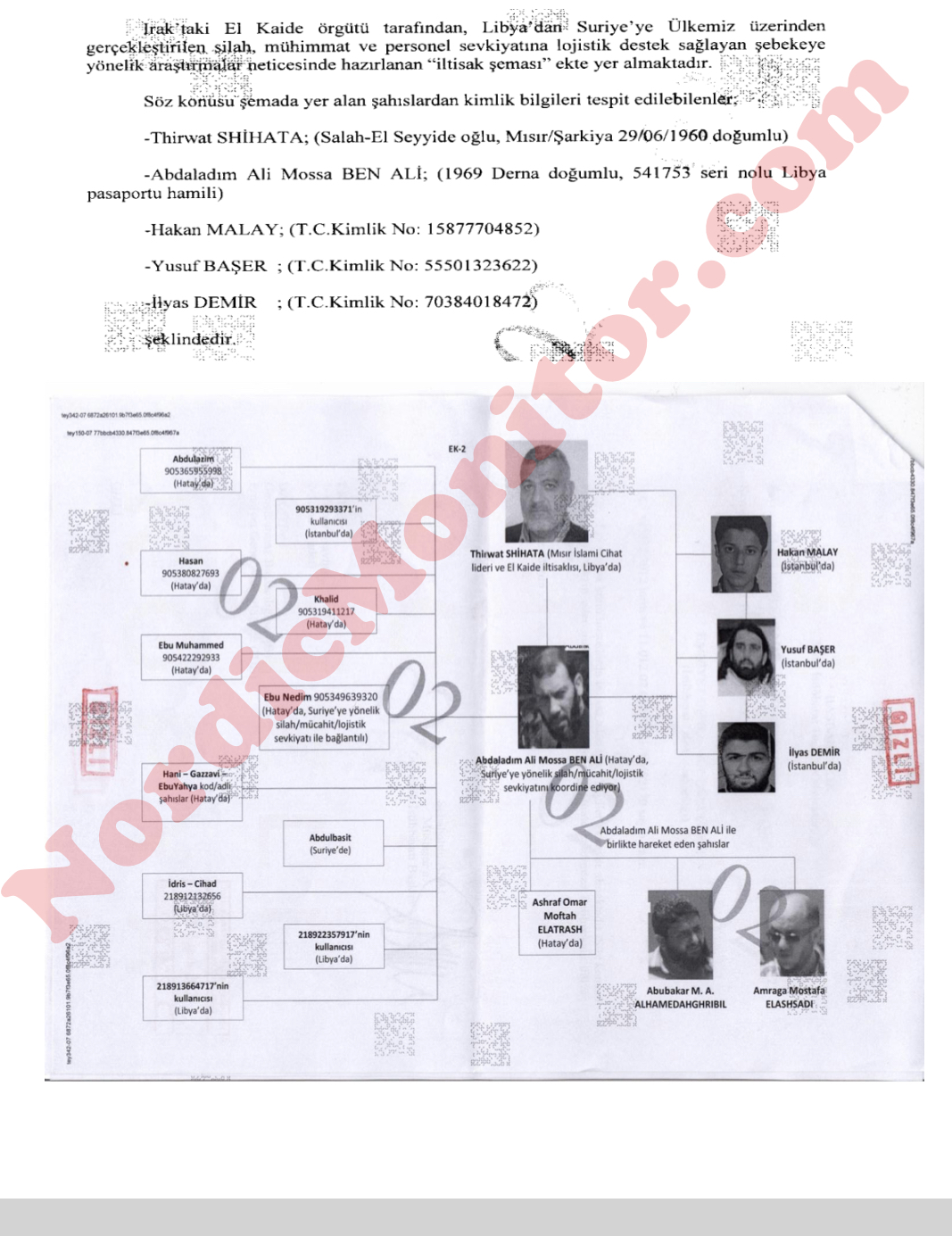 جاء في تقرير استخبارات الشرطة أن تنظيم بن علي أشرفَ على ترتيبات استقبال المقاتلين الأجانب القادمين من ليبيا ونقلهم إلى اقليم هاتاي على الحدود السورية التركية، وتضمن التقرير وثائق من الاستخبارات التركية توضح بالأدلة وجود صلات قوية تربط بين تنظيم القاعدة الإرهابي في ليبيا والنظام التركي الحاكم، وتعود هذه الاتصالات والأعمال الاستخبارية التنسيقية إلى عام 2012 وبالتحديد في شهر يوليو.
