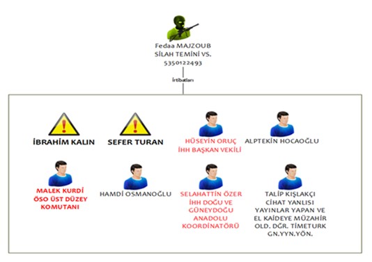 أوضح التقرير عن وجود صلات بين زعيم تنظيم بن علي و فداء المجذوب الذي كان على اتصال مباشر مع رجال القصر الرئاسي مثل إبراهيم كالين، المتحدث باسم الرئاسة التركية حالياً، وسفير توران، وهو أحد كبار المستشارين في رئاسة الجمهورية التركية الآن، حيث جرت بينهم اتصالات وعلاقات عمل أثناء القيام بترتيب عمليات نقل المقاتلين الأجانب والأسلحة إلى الأراضي السورية.