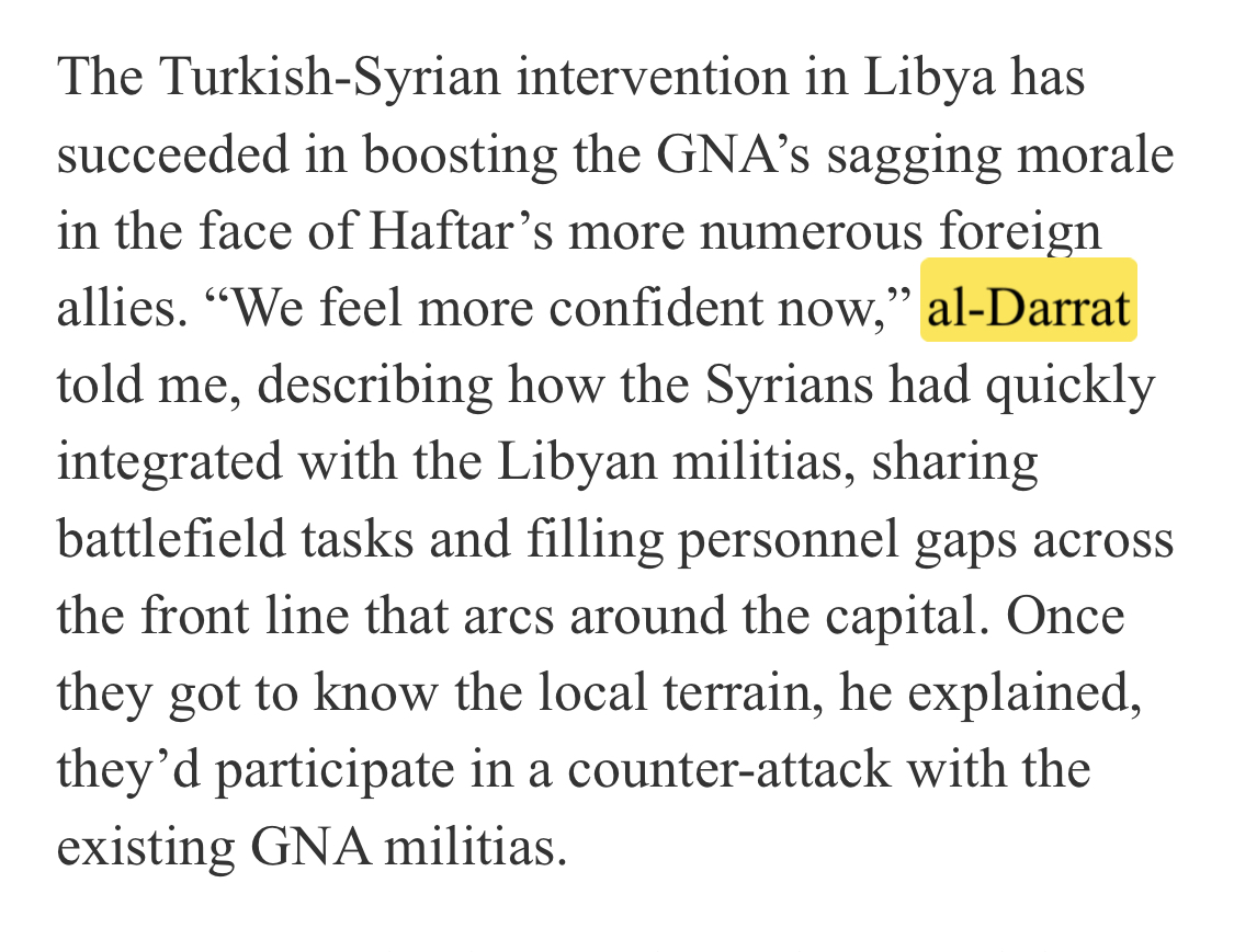 وأضاف الكاتب ؛ ” هذا القائد السوري يبلغ من العمر أربعة وثلاثين عامًا ، ومعه مقاتلين سوريين آخرين يبلغ عددهم حوالي خمسمائة في هذا الجزء من الجبهة ، أخبروني أنهم وصلوا ليبيا قبل عدة أيام وكانوا جزءًا من فرقة أكبر تضم  قبل شهر ، مع أفراد عسكريين أتراك. قالوا إن هناك خطط لجلب ستة آلاف مقاتل سوري إضافي ” .