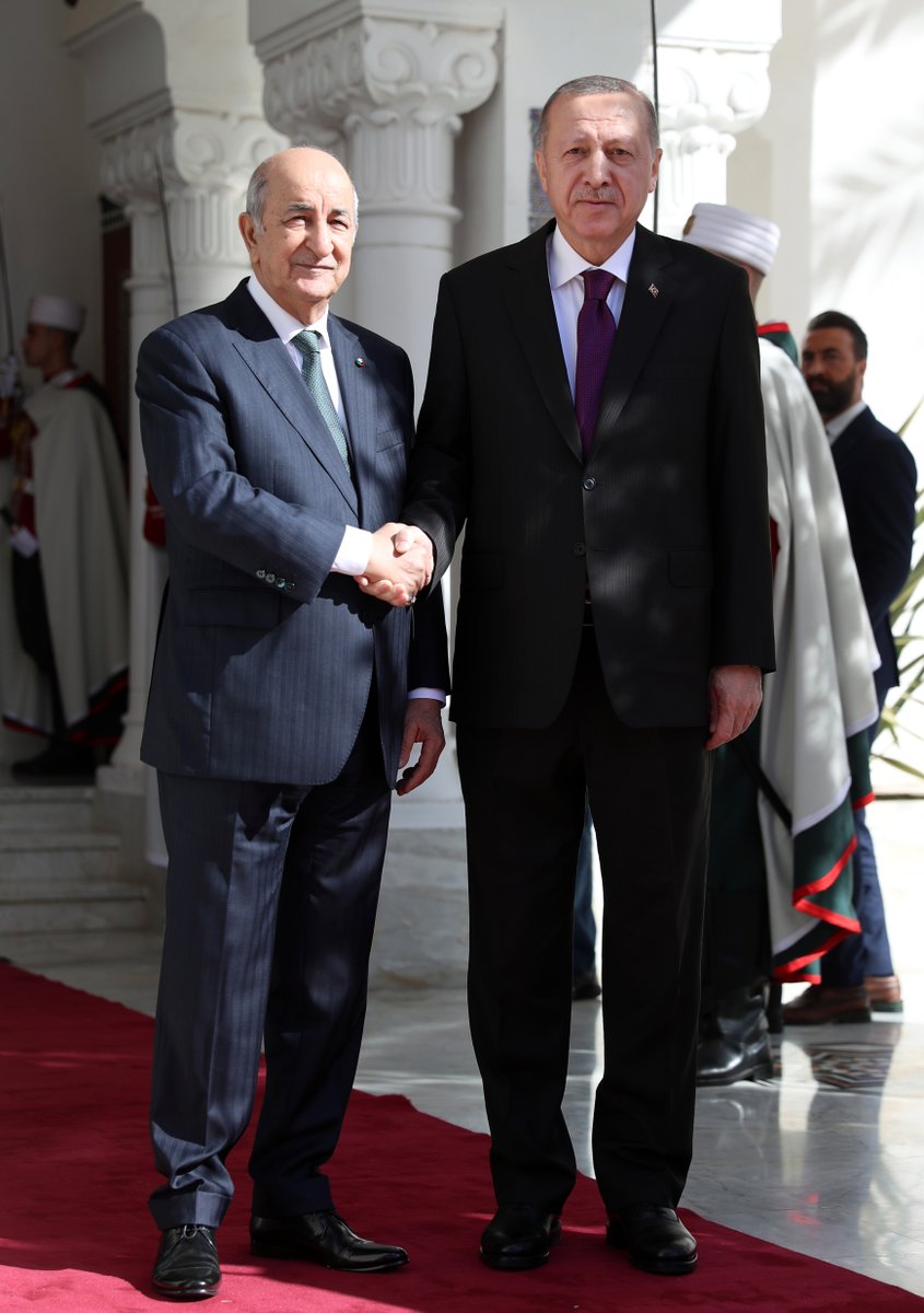 كما كان في استقبال اردوغان وفقاً لوكالة “الأناضول” التركية بمطار “هواري بومدين” الدولي بالعاصمة الجزائر عدد من المسؤولين الجزائريين على رأسهم الرئيس الجزائري.