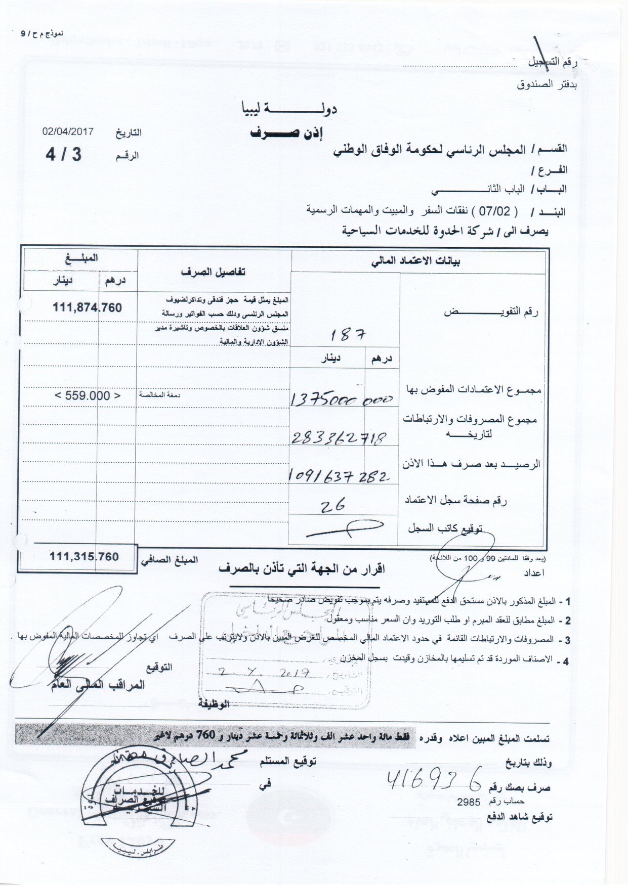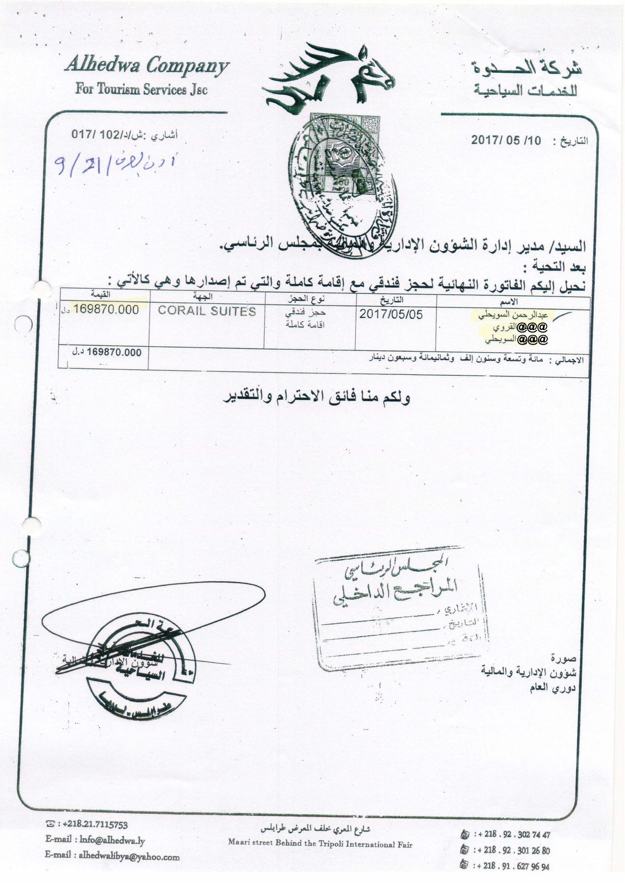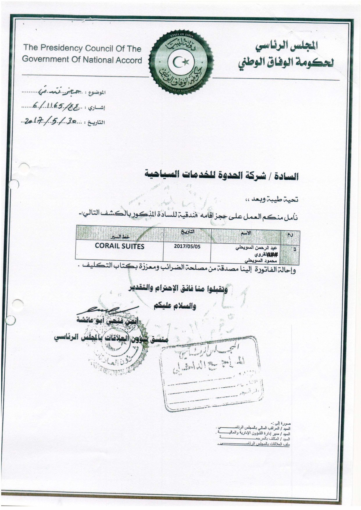 وأضاف : ” تم مراجعة حسابات المجلس الرئاسي من قبل الإدارة المختصة بالديوان عن العام 2017م وأظهرت نتائج الفحص وجود فواتير وأذونات صرف لصالح شركات سياحية (شركة الحدوة، وشركة الصهيل) تتعلق بنفقات إقامة السويحلي وعدد من أفراد أسرته (أقاموا معه بنفس الجناح في بعض الفواتير ومنفردين بفواتير أخرى) إبان توليه رئاسة المجلس الأعلى للدولة تم صرفها من قبل الإدارة المالية بديوان المجلس الرئاسي لحكومة الوفاق الوطني، مما يعد مخالفة وفقاً للتشريعات النافذة حيث وردت الواقعة بتقرير الديوان المنشور عن العام 2017م بالصفات وليس بالأسماء ” .