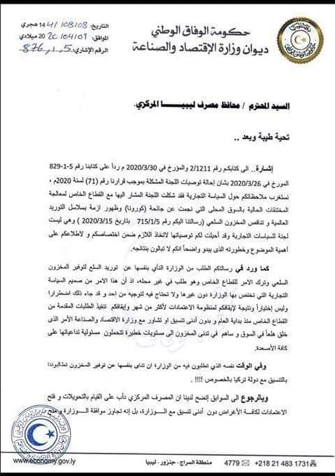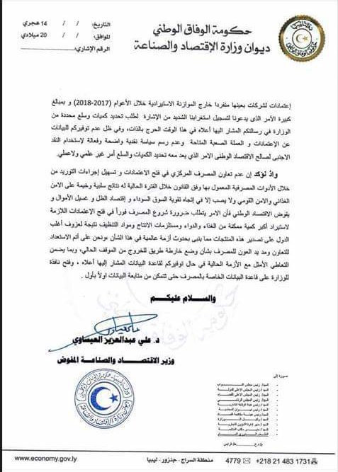 ليبيا – وجه وزير الصناعة والإقتصاد المفوض بحكومة الوفاق علي العيساوي خطاباً إلى محافظ مصرف ليبيا المركزي الصديق الكبير بشأن ملاحظات الأخير المتعلقة بالسياسيات التجارية.