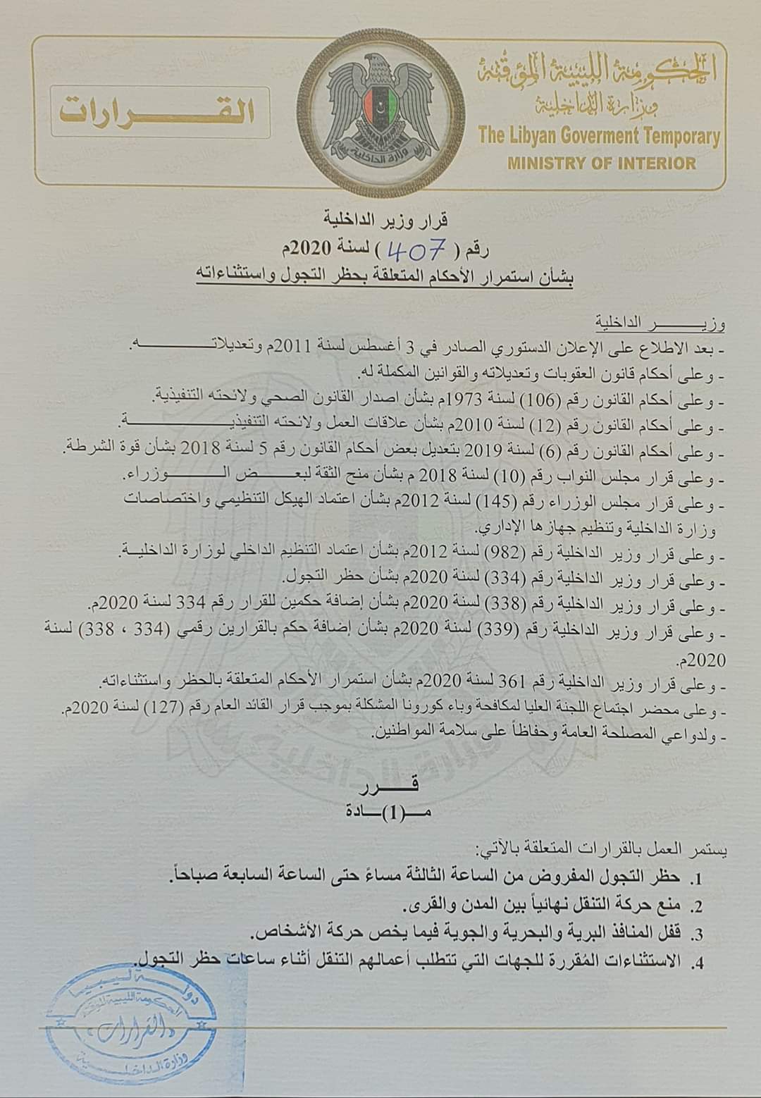المستشار بوشناف أكد في قراره رقم”407″ والذي تلقت المرصد نسخة منه الإستمرار بحظر التجول المفروض من الساعة الثالثة مساءً حتى الساعة السابعة صباحاً ومنع حركة التنقل نهائياً بين المدن و القرى بالإضافة إلى قفل المنافذ البرية والبحرية و الجوية فيما يخص حركة الأشخاص .