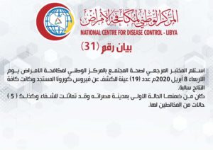 ليبيا – أصدر المركز الوطني لمكافحة الأمراض أمس الأربعاء بيانه رقم “31” عن استلام المختبر المرجعي لصحة المجتمع بالمركز أمس الأربعاء عدد 19 عينة جديدة للكشف عن فيروس كورونا المستجد.