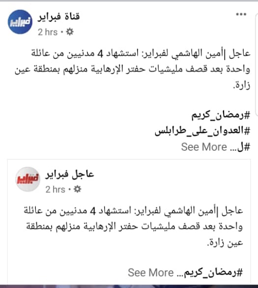 ليبيا – بعد مطالبة المدونين والمعلقين لها بكشف صور وشهادات وفاة الضحايا ، تراجعت وزارة الصحة بحكومة الوفاق ، على لسان المتحدث بإسمها مذيع قناة التناصح ، أمين الهاشمي عن رواية أعلنها مساء الجمعة حول مقتل 4 مدنيين من عائلة واحدة في عين زارة وقال أن الخبر بلاغ كاذب .