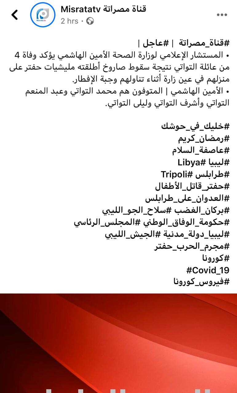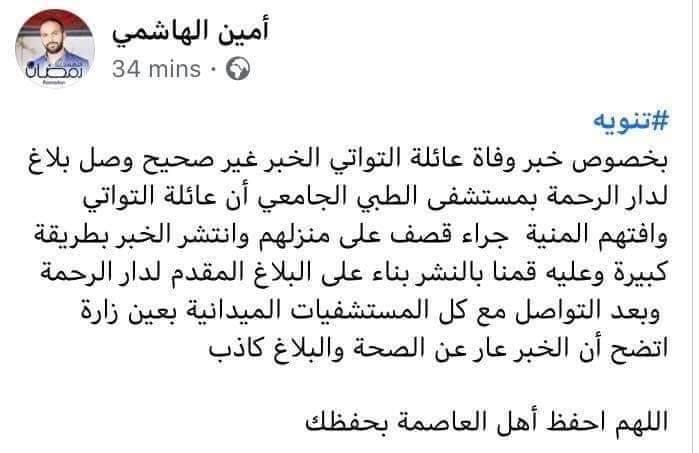 وقال الهاشمي أن الخبر الذي نشره وإتهم به ” مليشيات حفتر ” قبلها ، إتضح يأنه غير صحيح وقد تم بناءً على بلاغ وصل لدار الرحمة بمستشفى الطبي الجامعي أن عائلة التواتي وافتهم المنية جراء قصف على منزلهم .