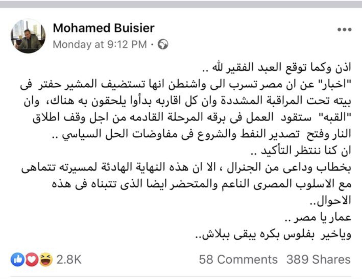 في اليومين الأخيرين عاد بويصير لسيرته الأولى من خلال كتابة الأماني على هيئة أخبار إذ زعم أن مصر تحتجز المشير حفتر عقب زيارة الأخيرة للقاهرة وبأنه – أي حفتر – يستعد لإلقاء خطاب وداعي وفق أسلوب مصري ناعم وحضاري .
