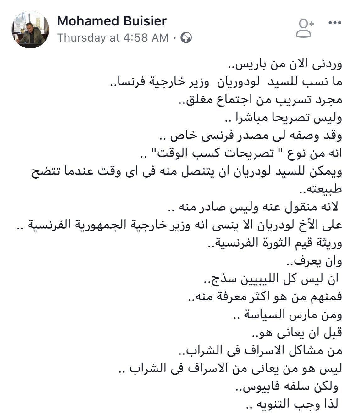 بل أنه ذهب حينها الى مطالبة كل من المستشار عقيلة والفريق الناظوري بتحمل مسؤولياتهم واختيار خلفًا للمشير كون الرجل قد مات حتى أن تصريح وزير الخارجية الفرنسي جان اف لورديان حينها عن إعتيادية الوضع الصحي للمشير بات وبحسب بويصر موضع شك كون الوزير الفرنسي مسرف فى تناول الكحول !!.