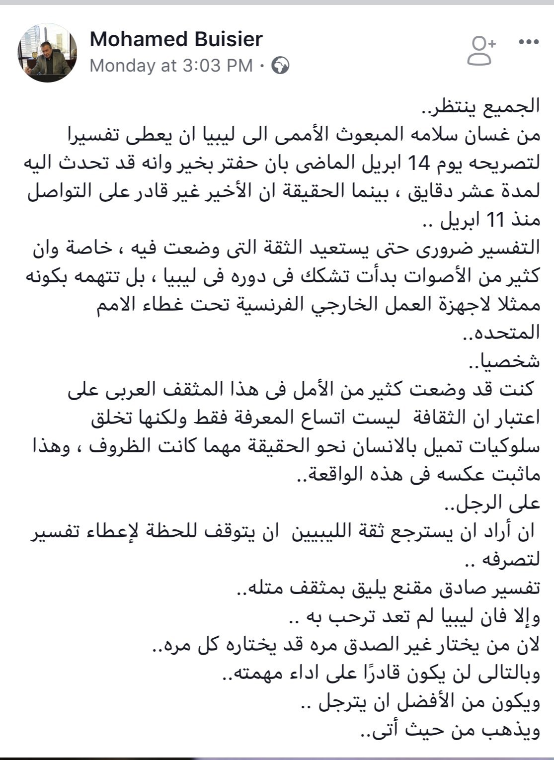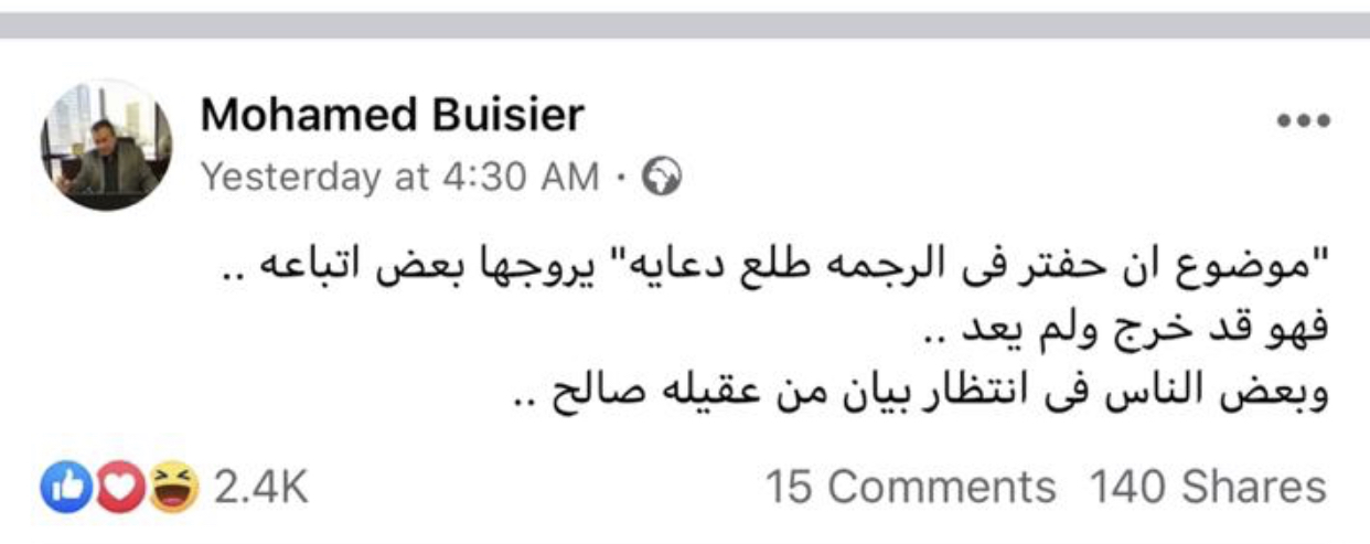 وعندما جادله بعض المعلقين في منشوراته بأن حفتر قد عاد بالفعل إلى بنغازي ، عاد وكتب بأن هذا الكلام مجرد ” دعاية ” وبأن حفتر خرج ولم يعد بل وذهب بعيدًا بالقول أن هناك من ينتظر بيان من المستشار عقيلة صالح ! .