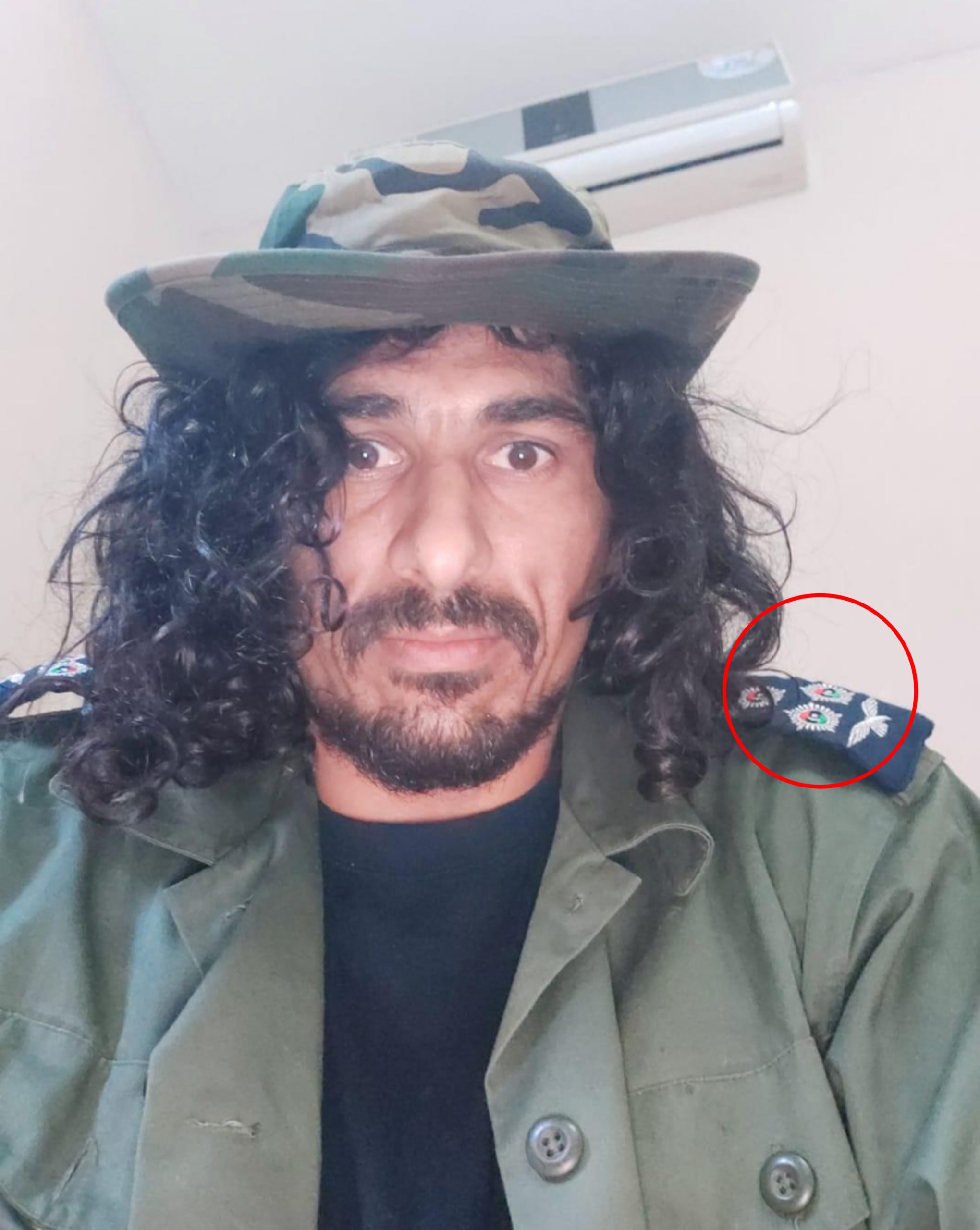 ونشر ” غليص ” عبر صفحته الشخصية صورة وهو يرتدي بزة عسكرية ( بدلة شغل خضراء ) مع قبعة للصاعقة على رأسه ورتبة للداخلية على يمين ويسار كتفيه كانت هي رتبة للداخلية غشلها عميد بنسر وثلاثة نجمات .