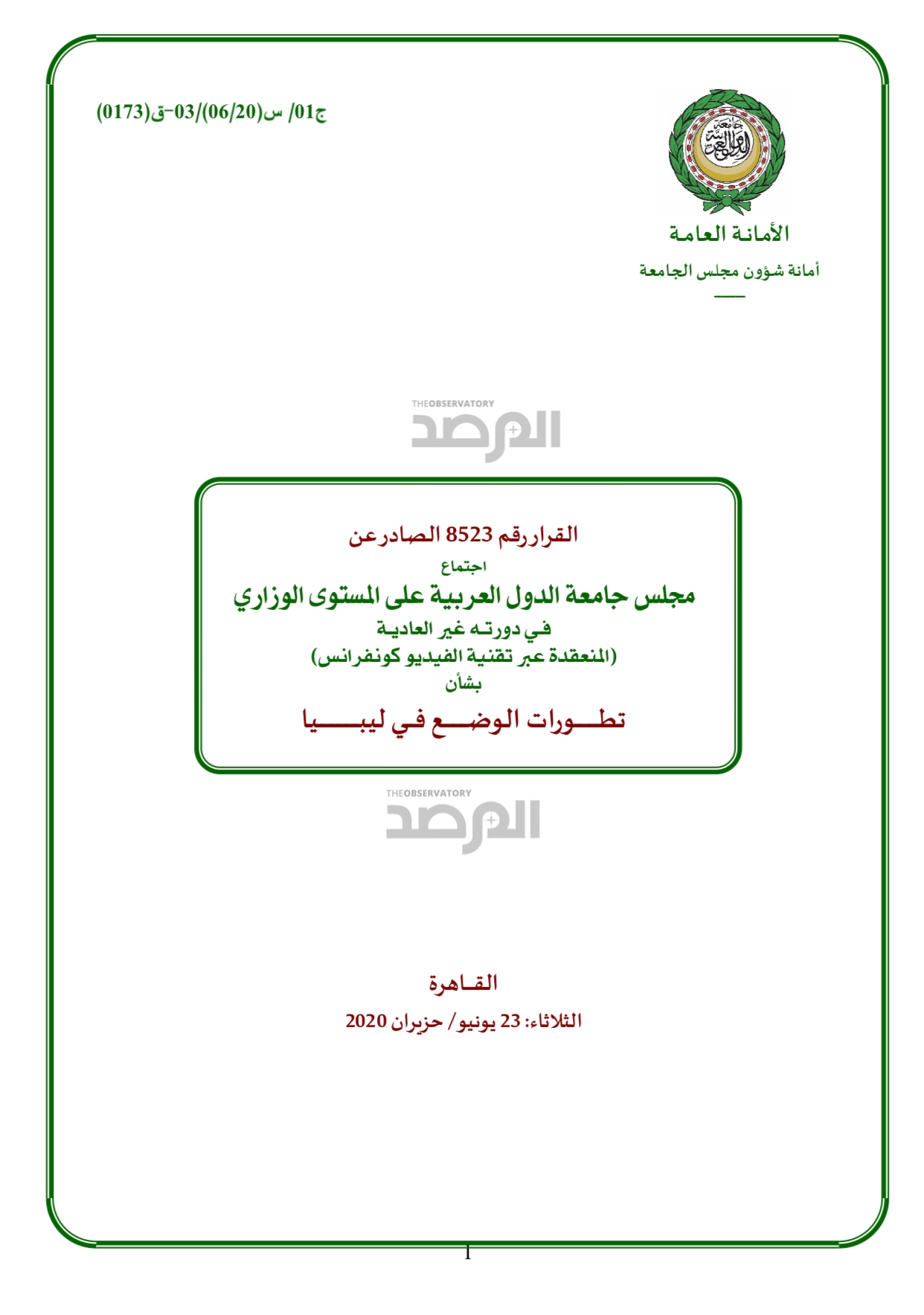 ليبيا – إجماع عربي حول ليبيا قل حدوثه تشكل اليوم في جامعة الدول العربية حول قرارها رقم 8524 المتعلق بتطورات الوضع والترحيب بإعلان القاهرة وتثبت وقف إطلاق النار وعدم تحريك الجبهات .