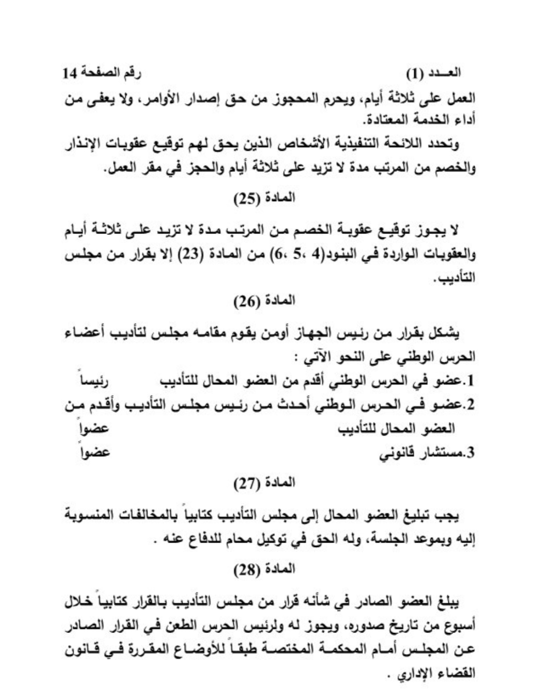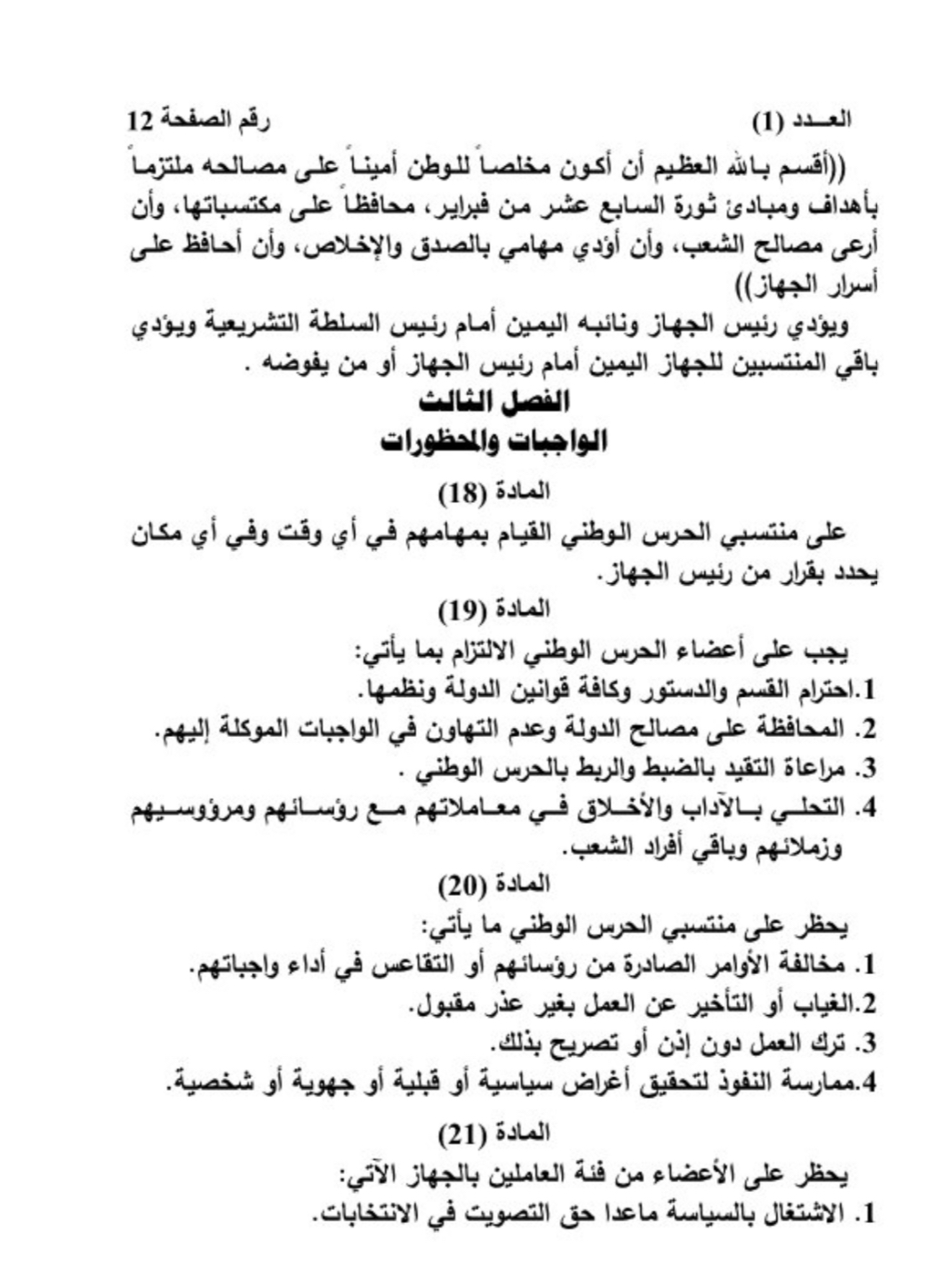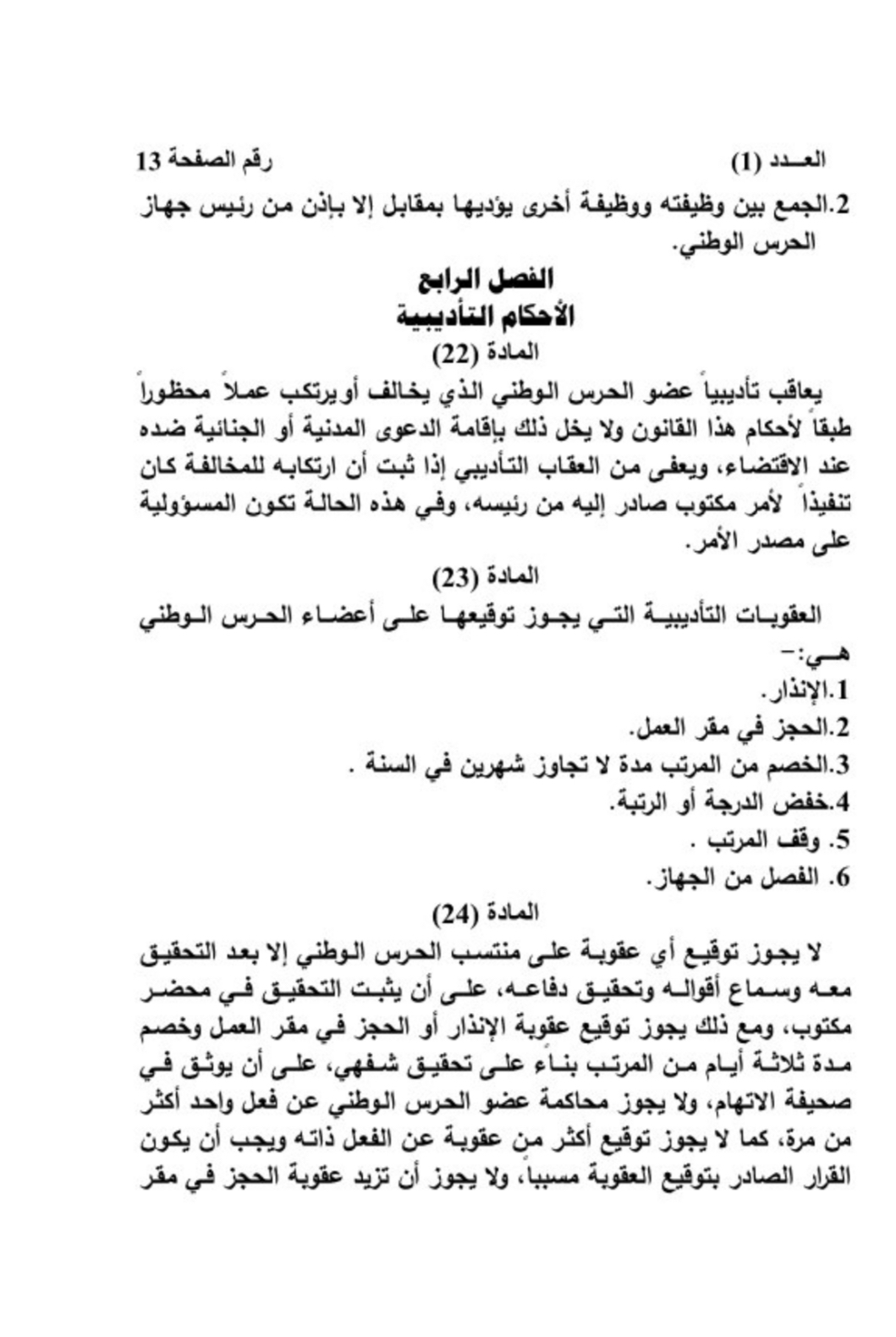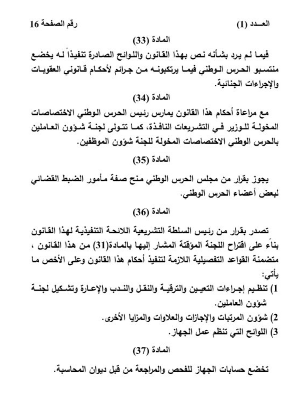 أما أخيرًا ، فتسري على منتسبي الحرس الوطني أثناء تأدية أعمالهم كافة التشريعات العسكرية النافذة بالنسبة لمنتسبيه من العسكريين ، أما بالنسبة لمنتسبيه من المدنيين فتسري عليهم التشريعات النافدة المنظمة ، أي أن الحقوق والامتيازات والمرتبات لأفراد المليشيات بعد إنضمامهم للحرس وإعادة تدويرهم فستكون مماثلة لخريجين الكليات العسكرية الذين لن يكن هناك أي داعٍ لهم لطالما أن أي مدني بصفة ” ثائر ” يستطيع أن يناظرهم في كل شيء .