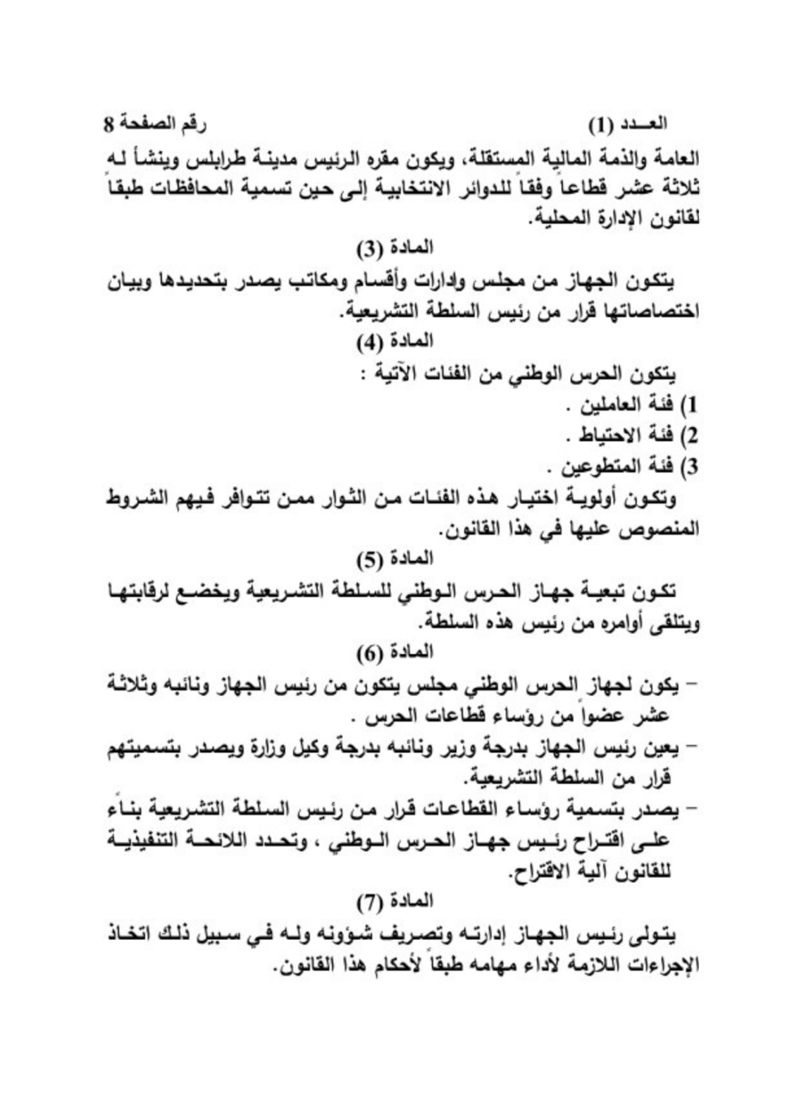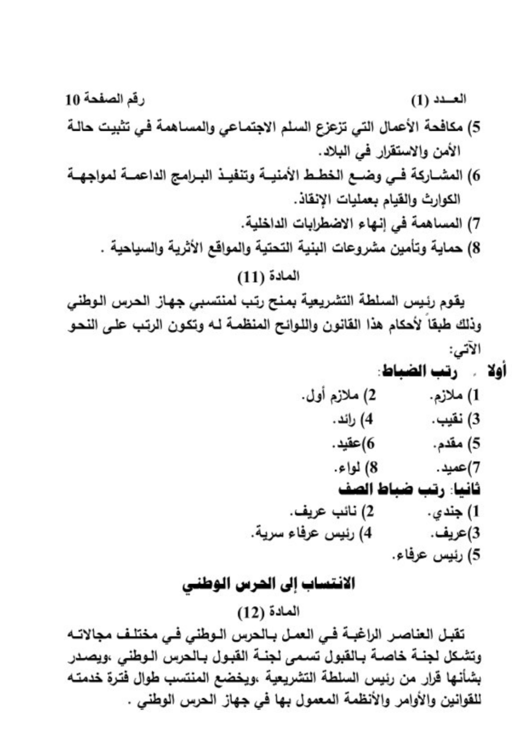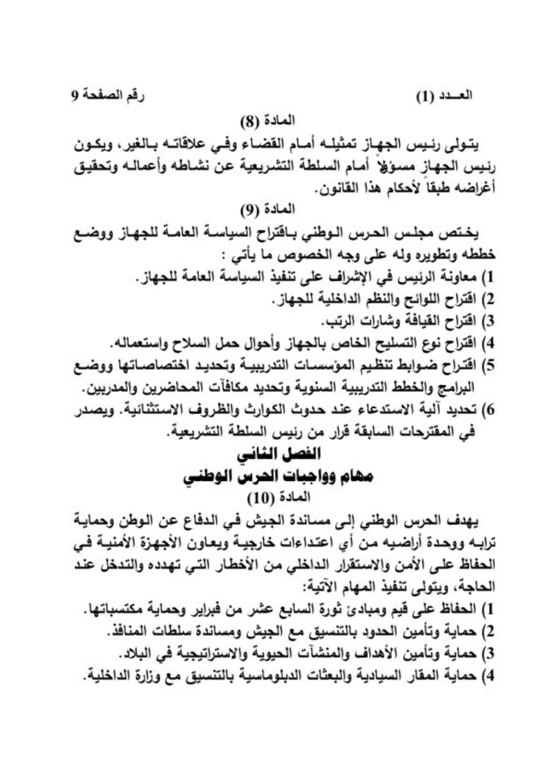 في المقابل يتولى آمر الحرس الوطني تقديم مقترح القوة العمومية مبينا فيها الملاك للوظائف العسكرية والمدنية واماكن توزيعها واحتياجاته من المقار والاسلحة والذخائر والمعدات والآليات والمهمات وكافة التجهيزات المطلوبة لمباشرة المهام والواجبات المكلف بها ، وذلك علاوة على الترسانة الحالية مايعني إنفاق المزيد على تسليح المليشيات بعد تدويرها .