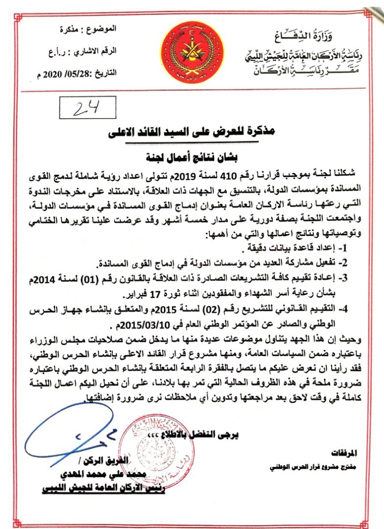 ومن جهته وجه رئيس أركان الوفاق محمد الشريف كتابًا للسراج بناءً على طلب الأخير بحيث تنشأ قوة عسكرية تسمى ” الحرس الوطني” يتبع القائد الأعلى للجيش الليبي ( أي السراج مباشرة ) وفقًا للقانون رقم 2 لسنة 2015 الصادر من المؤتمر العام بعد إنقلاب فجر ليبيا , وتكون للحرس الشخصية الاعتبارية والذمة المالية المستقلة عن أي جهة عسكرية نظامية أخرى كالجيش مثلًا ، ويأتي هذا بعد فشل جهاز الحرس الرئاسي وتفككه هو الآخر بعد صراع مع المليشيات انتهى بطرده من غالبية مقاره وافتكاك عتاده وأسلحته وفرار آمره نجمي الناكوع خارج البلاد.