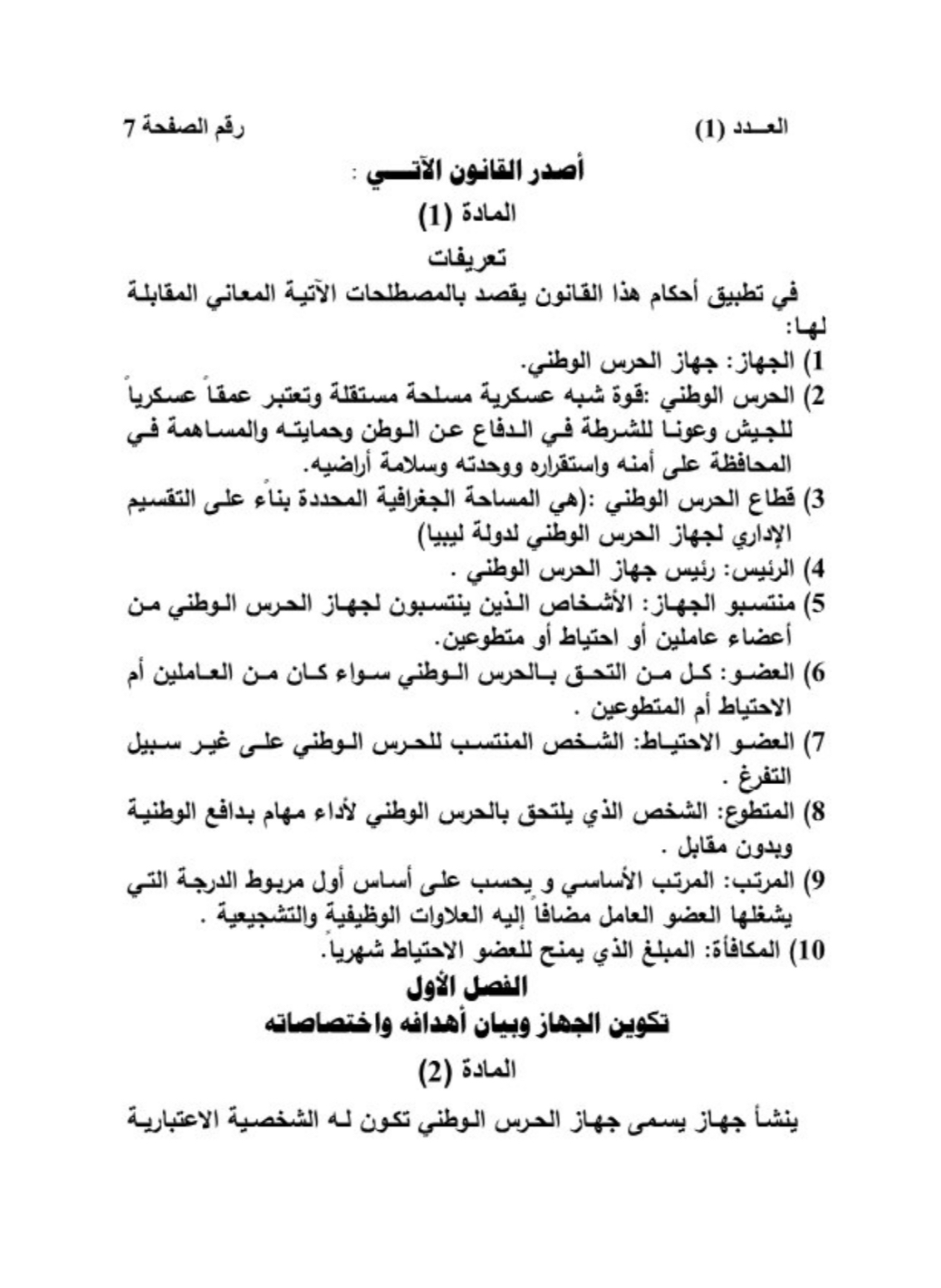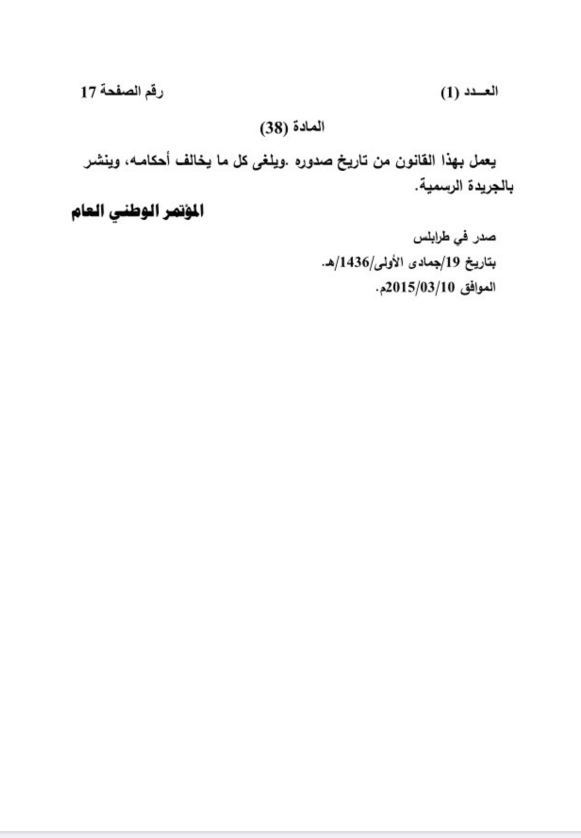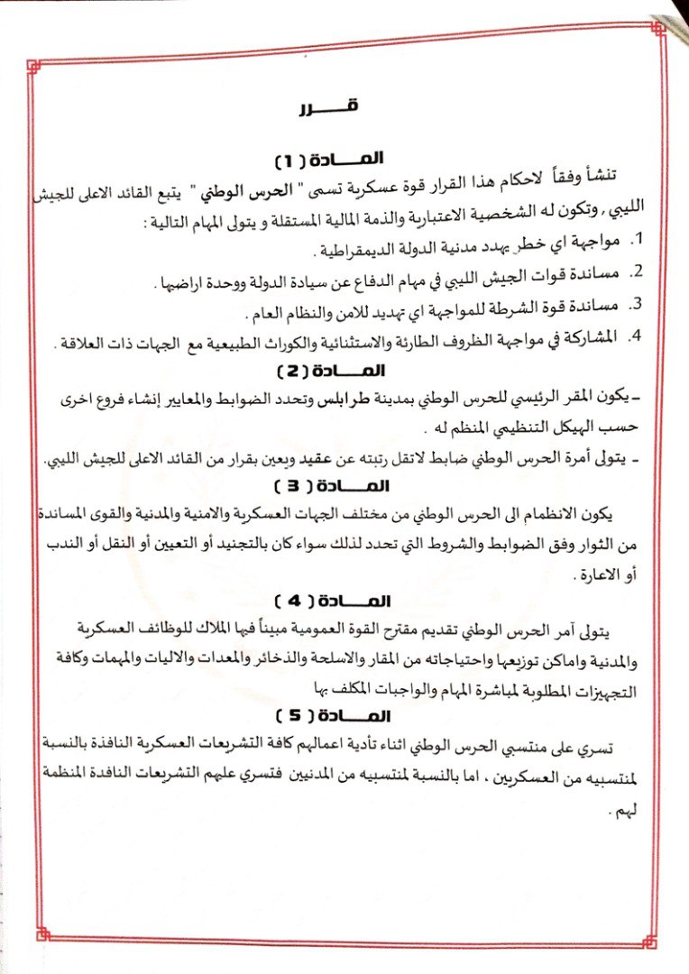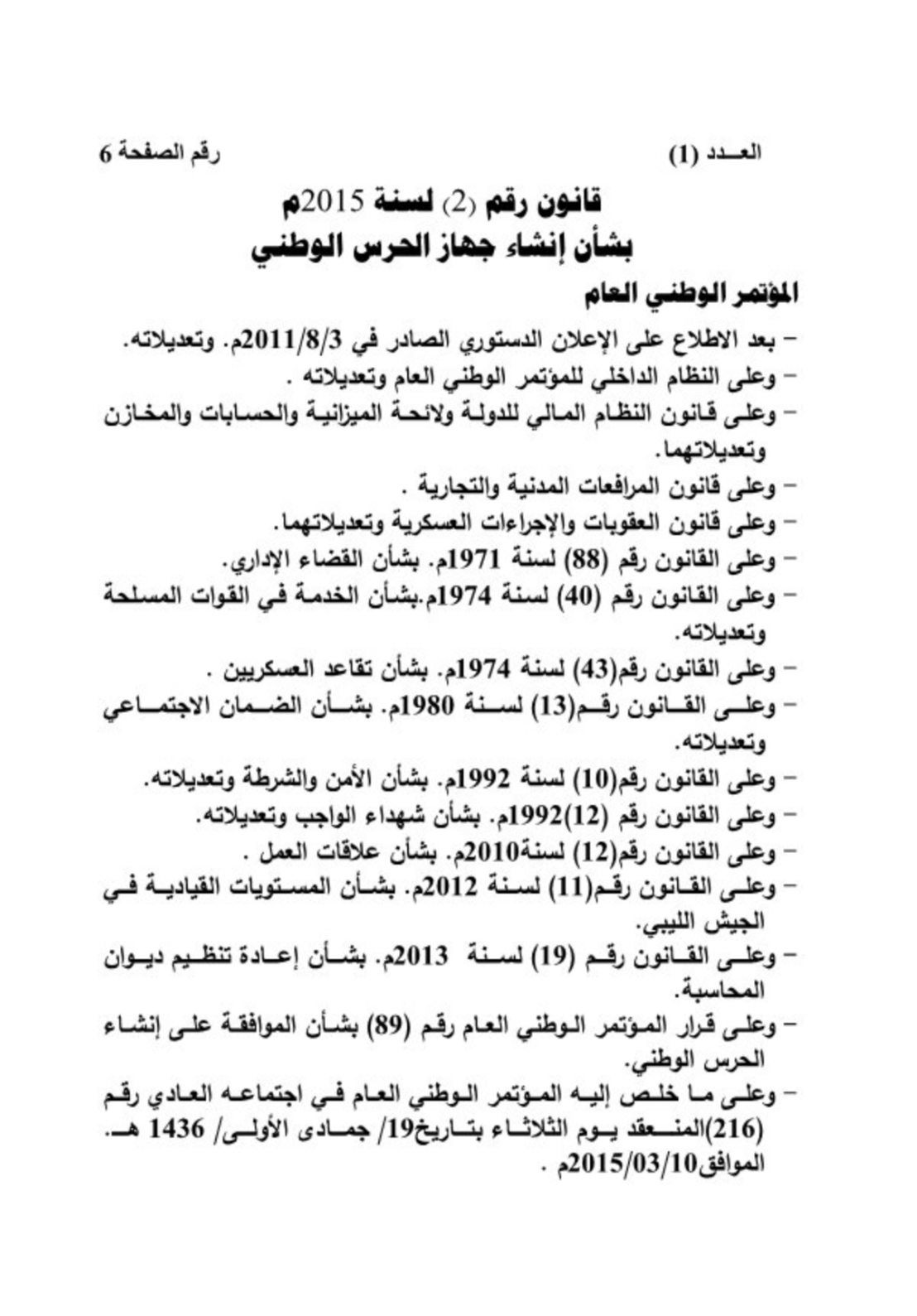 وفي مايلي تنشر المرصد نص قرار المؤتمر العام رقم 2 لسنة 2015 الموقع من نوري أبوسهمين بعد إنقلاب فجر ليبيا بشأن تشكيل الحرس الوطني :