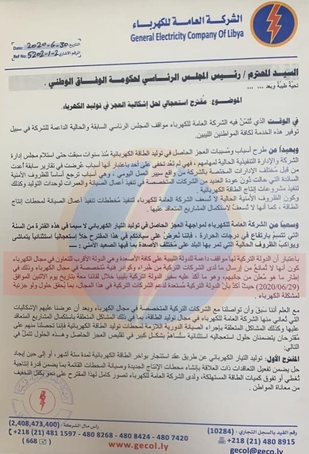 وبينما كان يتحدث عبر قناة فبراير ، نشر ساسي صورة من مقترح قدمه للرئاسي اليوم يتضمن هذا العرض التركي بشراء محطات متنقلة وسفن توليد وقد ذكر في عرضه أن تركيا دولة داعمة لهم على كل الأصعدة وهي الأقرب – أي الأولَى – بهذه العقود ، وهذا ما يبدوا أنه لسان حال السفير التركي أيضًا على طريقة ” حررناكم ” وبذلك تكون الكرة قد رُميت في ملعب السراج الذي سيظر بمظهر من يريد استمرار الأزمة في حال رفضها .