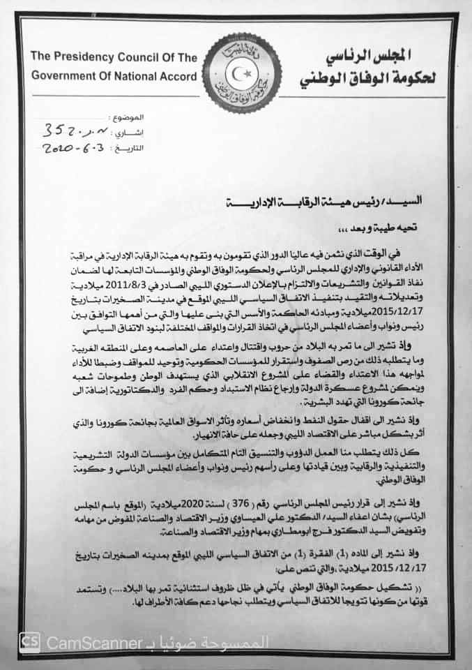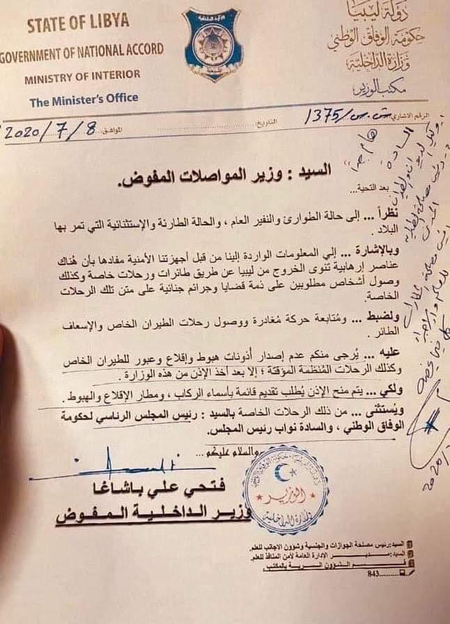 ليبيا – وجه وزير داخلية الوفاق فتحي باشاآغا رسالة إلى وزير المواصلات بالوفاق ميلاد معتوق يطالبه فيها بضرورة إعلامه بأسماء ركاب الرحلات الخاصة التي تتحرك من المطارات الواقعة تحت سيطرتهم في غرب البلاد وعدم السماح لأي منها إلا بعد هذا الإجراء .