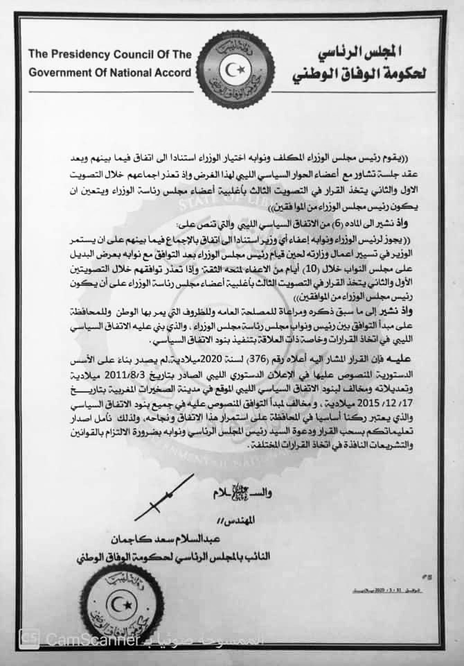وبالإشارة لقانون الطوارئ فقد باتت أطراف في معسكر الوفاق نفسه تصفه بأنه ” إداة استبداد” تضاف لاستبداد السراج بالقرار وهو مادفع عضو المجلس الإخواني عبدالسلام كاجمان الى المطالبة بتعليق إصدار القرارات وصرف الأموال بشكل فردي دون محاضر اجتماع وفقًا للاتفاق السياسي الذي يتجاهل كاجمان تنصيصه على أن كل القرارات حتى التي تصدر بحضوره مخالفة للصخيرات الذي يشترط الإجماع بين الأعضاء الذين استقال وتغيب منهم أربعة .