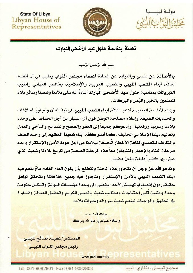 ليبيا – قدم رئيس مجلس النواب المستشار عقيلة في بيان له التهاني لكافة أبناء الشعب الليبي والشعوب العربية والإسلامية بخالص وأطيب التبريكات بمناسبة حلول عيد الأضحى المُبارك ، داعياً الله عز وجل بأن يعيد هذا العيد على البلاد وشعبها وسائر بلاد المسلمين بالخير واليُمن والبركات .