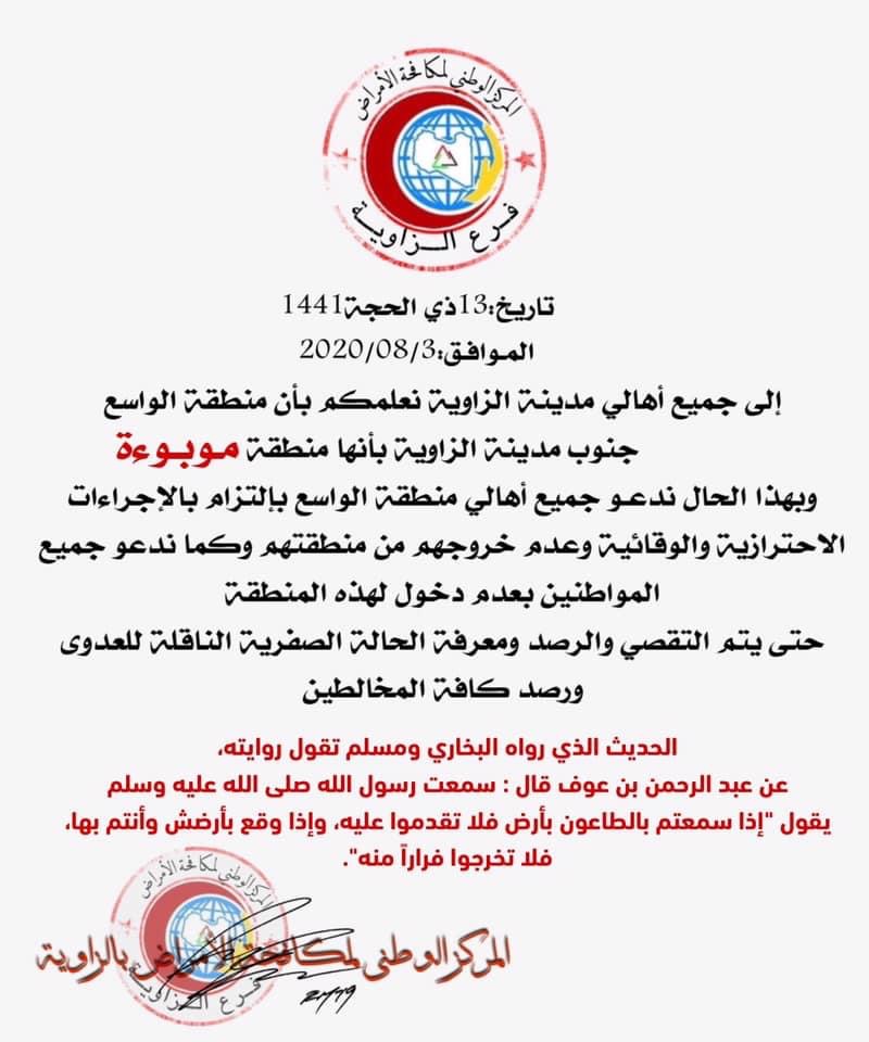 وقال فرع المركز في بيان مقتضب أن منطقة ( الواسع ) الواقعة جنوب مدينة الزاوية موبوءة بفيروس كورونا مطالبًا سكانها بعدم الخروج منها تنفيذًا لتعاليم الدين .