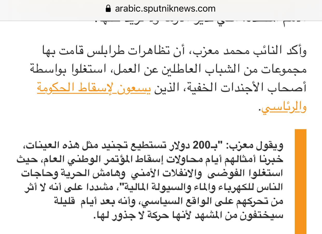 معزب وفي تصريح لوكالة “سبوتنيك” الروسية أمس الخميس أضاف: “بـ200 دولار تستطيع تجنيد مثل هذه العينات، خبرنا أمثالهم أيام محاولات إسقاط المؤتمر الوطني العام، حيث استغلوا الفوضى والانفلات الأمني وهامش الحرية وحاجات الناس للكهرباء والماء والسيولة المالية”، مشددًا على أنه لا أثر من تحركهم على الواقع السياسي وأنه بعد أيام قليلة سيختفون من المشهد لأنها حركة لا جذور لها.