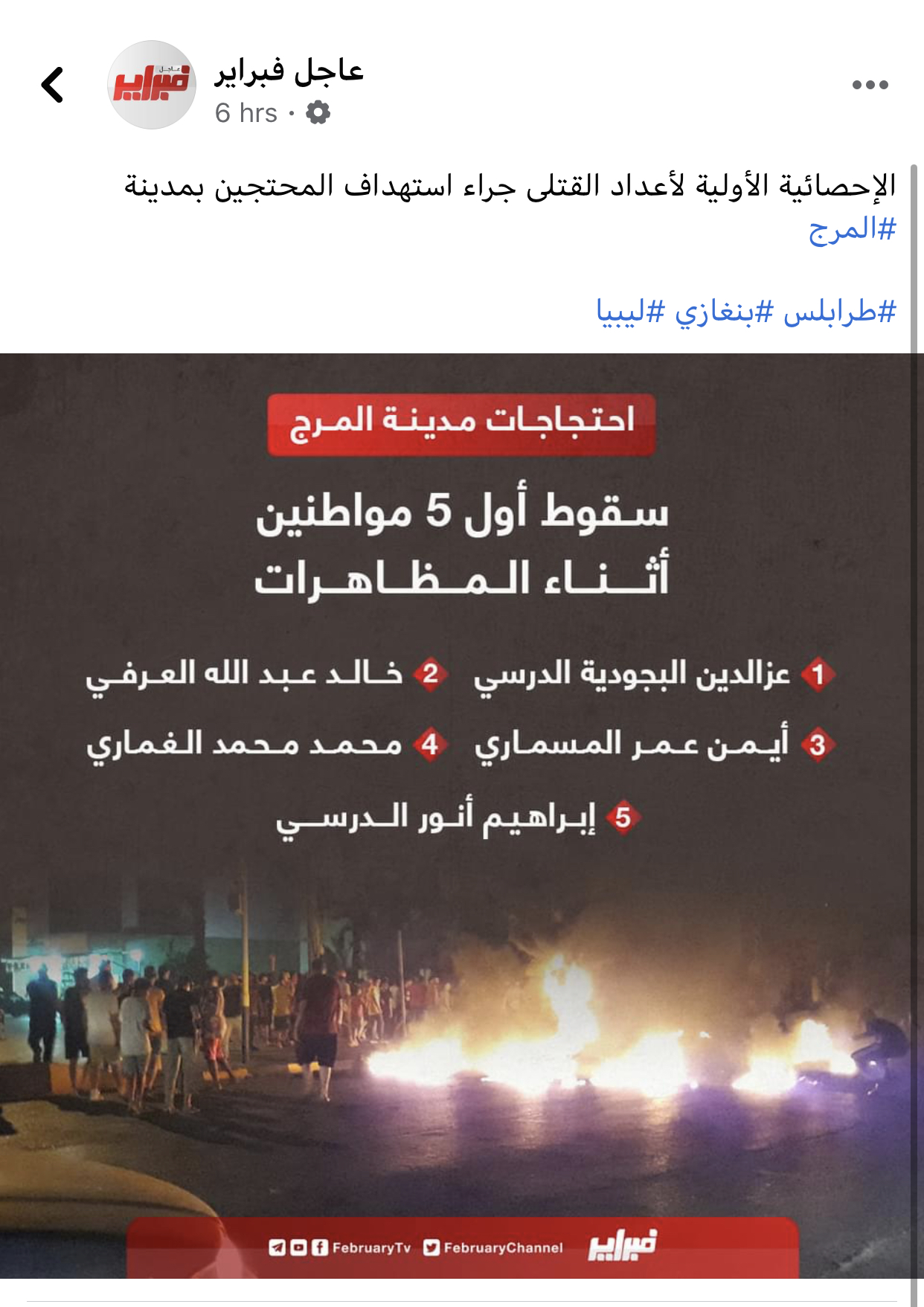 عاجل | إدارة مستشفى #المرج العام : ننفي صحة الخبر الذي نشرته قناة فبراير عن مقتل 5 متظاهرين في حادثة المديرية وجميع الأسماء الواردة في القائمة كقتلى " أسماء وهمية " ومنهم واحد متوفي منذ سنة 2016 . #ليبيا #المرصد pic.twitter.com/ej3rySOWnF