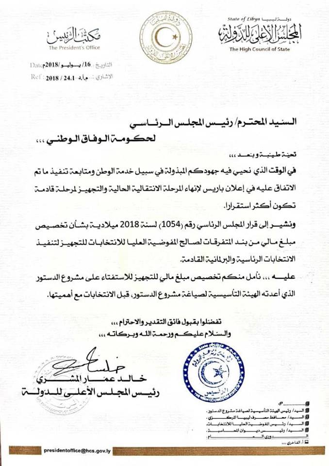وكان آخر وأول المتمسكين بهذه المسودة رئيس مجلس الدولة الاستشاري خالد المشري الذي طالب رئيس المجلس الرئاسي فائز السراج مرارًا وتكرارًا في 2018 بتخصيص ميزانية لمفوضية الانتخابات لاجراء الاستفتاء فى اشارة منه الى ان هذا الامر كان يجب ان يتم عوضاً عن صرف ميزانية للانتخابات الامر الذي أثار علامات استفهام حول هذا الموقف وسر التمسك بهذا المطلب.