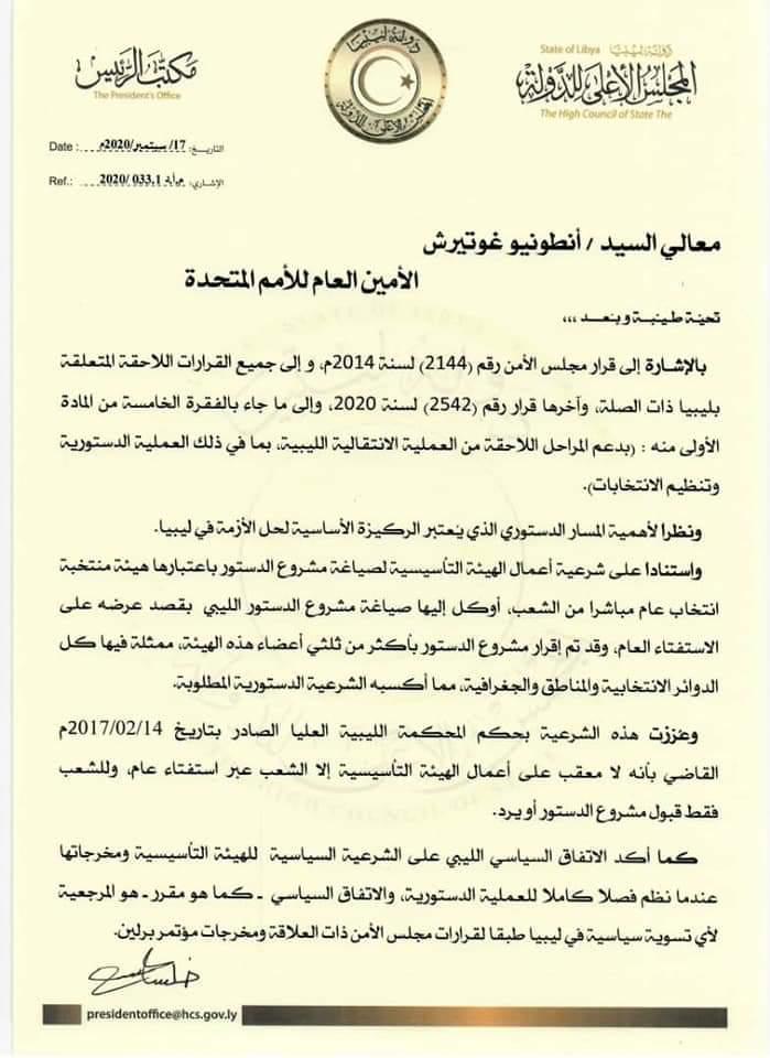 اليوم وبعد عامين على تلك الرسالة وبعد 9 سنوات كاملة على انتخابه في المؤتمر الوطني الذي تحور لاحقًا إلى مجلس دولة يمتص الميزانيات والمرتبات أسوة ببقية المجالس ، يعود المشري مجددًا ليطللب من أمين عام الأمم المتحدة دعم الإستفتاء على الدستور .
