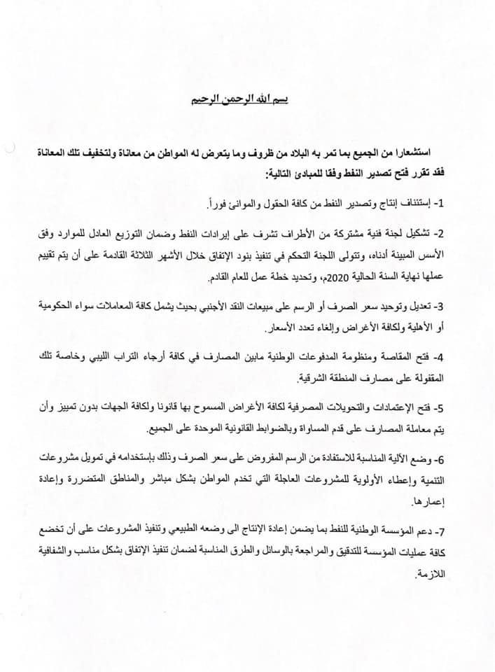 ودعا الاتفاق إلى وضع آلية مناسبة للاستفادة من الرسم المفروض على سعر الصرف وذلك بإستخدامه في تمويل مشروعات التنمية وإعطاء الأولوية للمشروعات العاجلة التي تخدم المواطن بشكل مباشر والمناطق المتضررة وإعادة إعمارها ودعم المؤسسة الوطنية للنفط بما يضمن إعادة الإنتاج الى وضعه الطبيعي وتنفيذ المشروعات على أن تخضع كافة عمليات المؤسسة التدقيق والمراجعة بالوسائل والطرق المناسية لضمان تنفيذ الإتفاق بشكل مناسب والشفافية اللازمة.