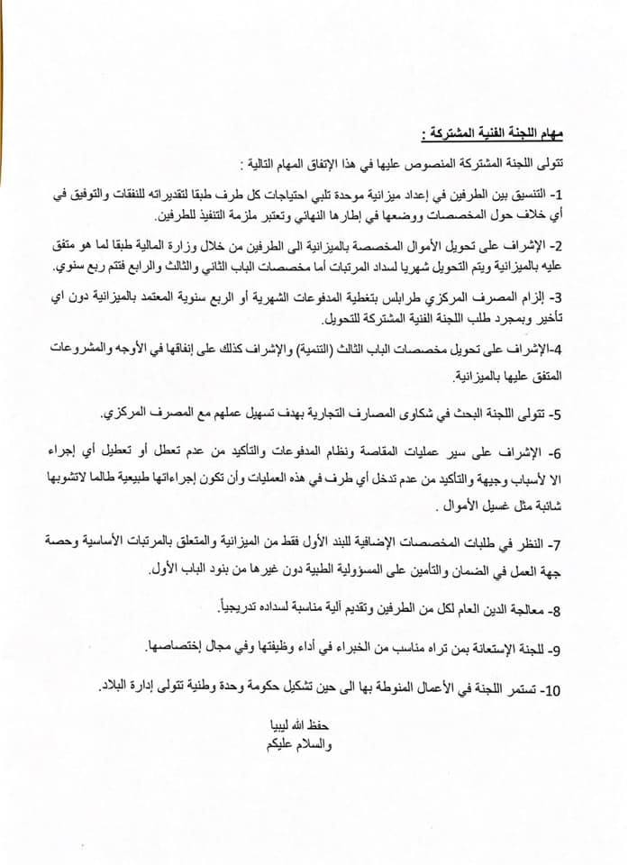 3- إلزام المصرف المركزي طرابلس بتغطية المدفوعات الشهرية أو الربع سنوية المعتمد بالميزانية دون أي تاخير وبمجرد طلب اللجنة الفنية المشتركة للتحويل.
