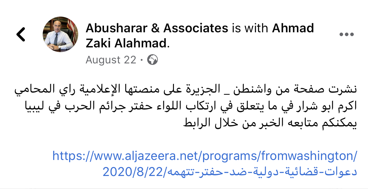 ليبيا – ادعى محامي هجرة وجنسية فلسطيني يقيم في الولايات المتحدة الأمريكية اطلاعه في القانون الدولي والقانون الدولي الإنساني مدعيًا رفع قضية لدى محكمة الجنايات الدولية في لاهاي ضد المشير خليفة حفتر .