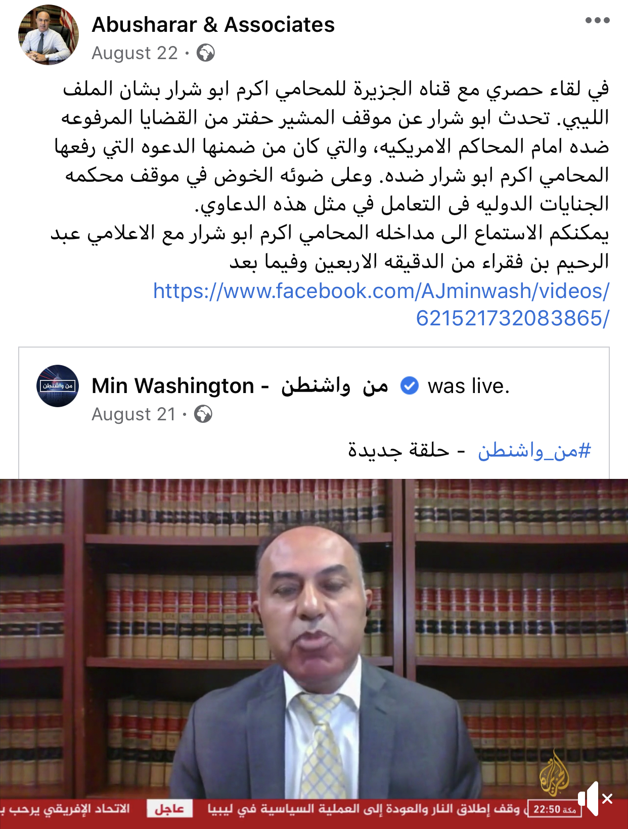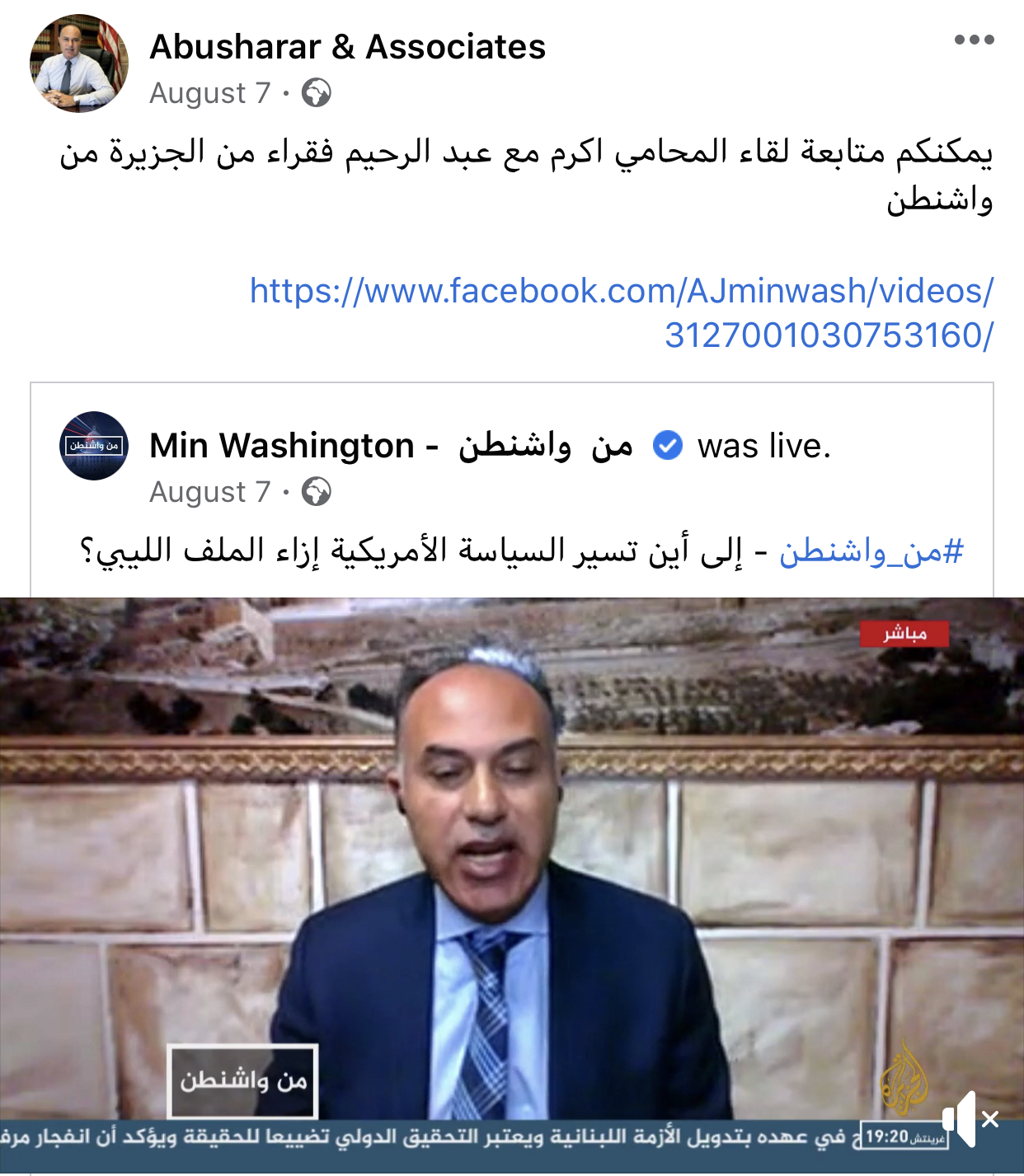 وقد ظهر هذا الشخص عبر ” قناة ليبيا الأحرار ” ويدعى ” أكرم أبوشرار ” من خلال استضافته عبر سكايب من ولاية كاليفورنيا وقد تحدث مطولًا في الملف الليبي وخاصة الشق الجنائي منه بلغة مليئة بعدم فهم طبيعة الصراع الليبي وعلى رأسه ادعائه بأن ” حكومة الوفاق منتخبة وتمثل الشعب الليبي على هذا الأساس ” رغم ان الوفاق ذاتها تؤكد بأنها حكومة ” توافقية ” وليست منتخبة ! .