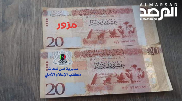 ليبيا – حذّرت مديرية أمن شحات أمس الأحد من وجود عملة ليبية مزوّرة فئة العشرين دينار، مطالبة المواطنين بالإبلاغ عنها فورًا.