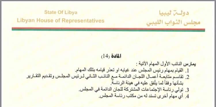 وبيّن أنه ووفقا للمادة “3” والفقرة الأولى من المادة “14” من النظام الداخلي لمجلس النواب الليبي بإمكان النائب الأول الدعوة لاجتماع أعضاء المجلس.
