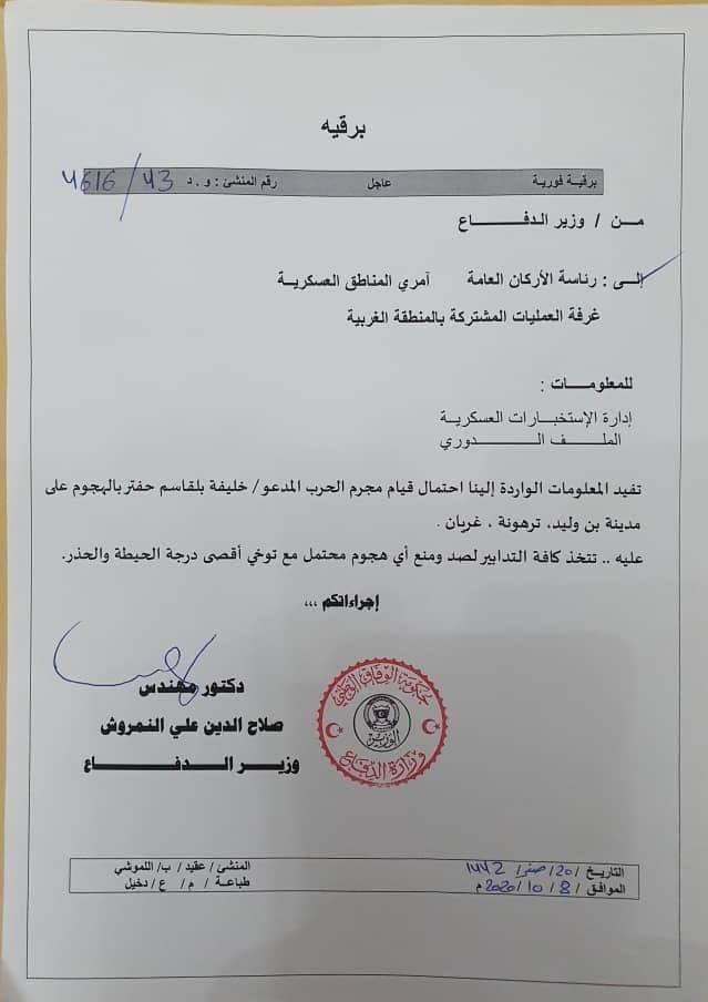 ليبيا – نفى مصدر عسكري مسؤول رفيع المستوى بالقيادة العامة للقوات المسلحة صحة ما أعلنه وزير دفاع الوفاق المُعين حديثًا صلاح الدين النمروش جملة وتفصيلًا عن تحريك الجبهات في إتجاه مدن الغرب في ترهونة وغريان وبني وليد وقال أن ما يجري من تحركات هي روتينية في إطار تبديل الورديات في غرب سرت والجفرة .