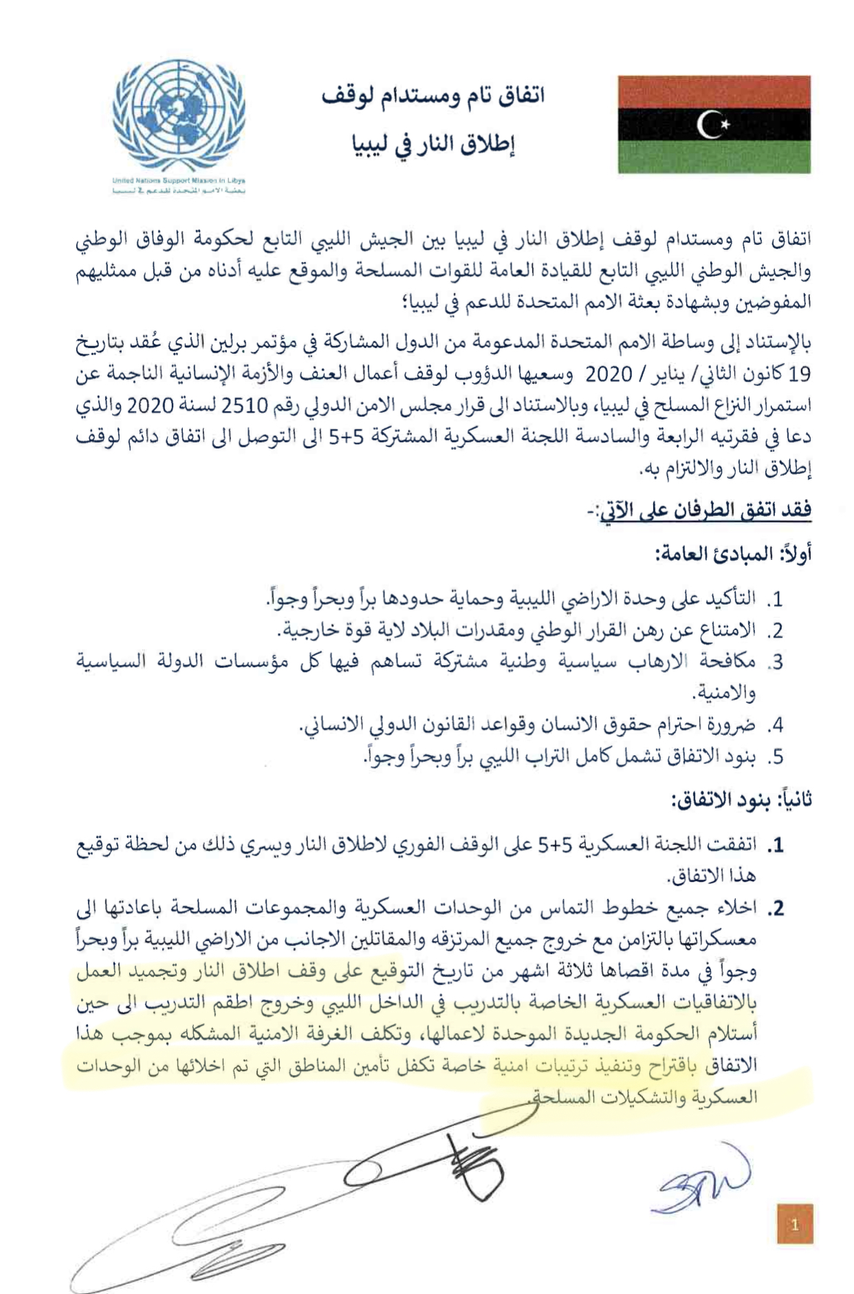 ولاقى اتفاق وقف إطلاق النار المعلن عنه أمس في جنيف بين اللجنة العسكرية الممثلة لكل من القيادة العامة للقوات المسلحة وحكومة الوفاق ترحيبًا دوليًا وإقليميًا واسعًا بإستثناء تركيا .