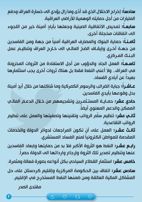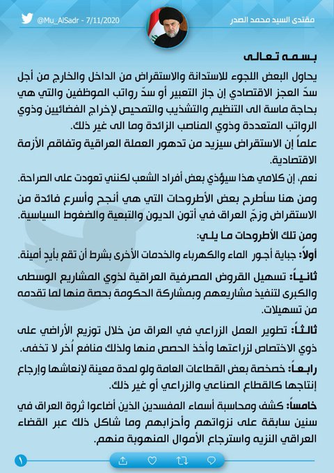 العراق – طرح زعيم التيار الصدري في العراق، مقتدى الصدر، اليوم السبت، 16 “حلا” كبدائل للاقتراض الذي تعمل الحكومة العراقية عليه.