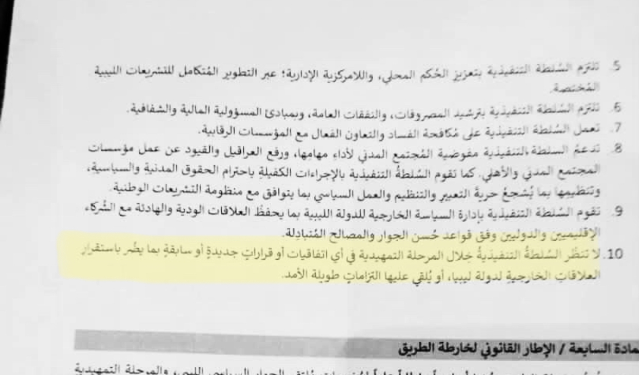 ونصت هذه المادة رقم 10 المتفرعة من المادة السادسة على : ” أن لا تنظر السلطة التنفيذية الجديدة خلال المرحلة القادمة في أي اتفاقات او قرارات جديدة او سابقة بما يضر باستقرار العلاقات الخارجية لدولة ليبيا أو يلقي عليها إلتزامات طويلة الأمد ” .