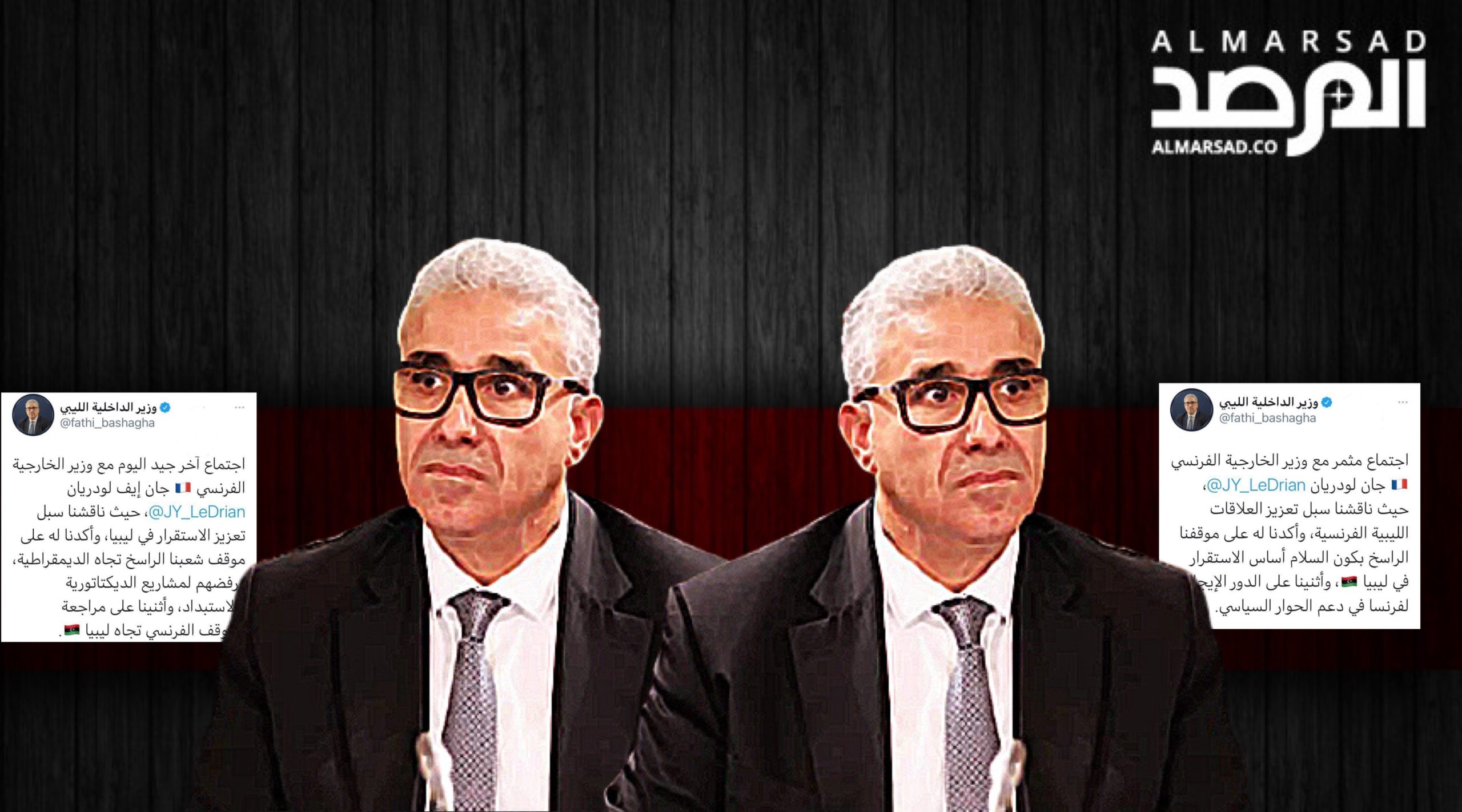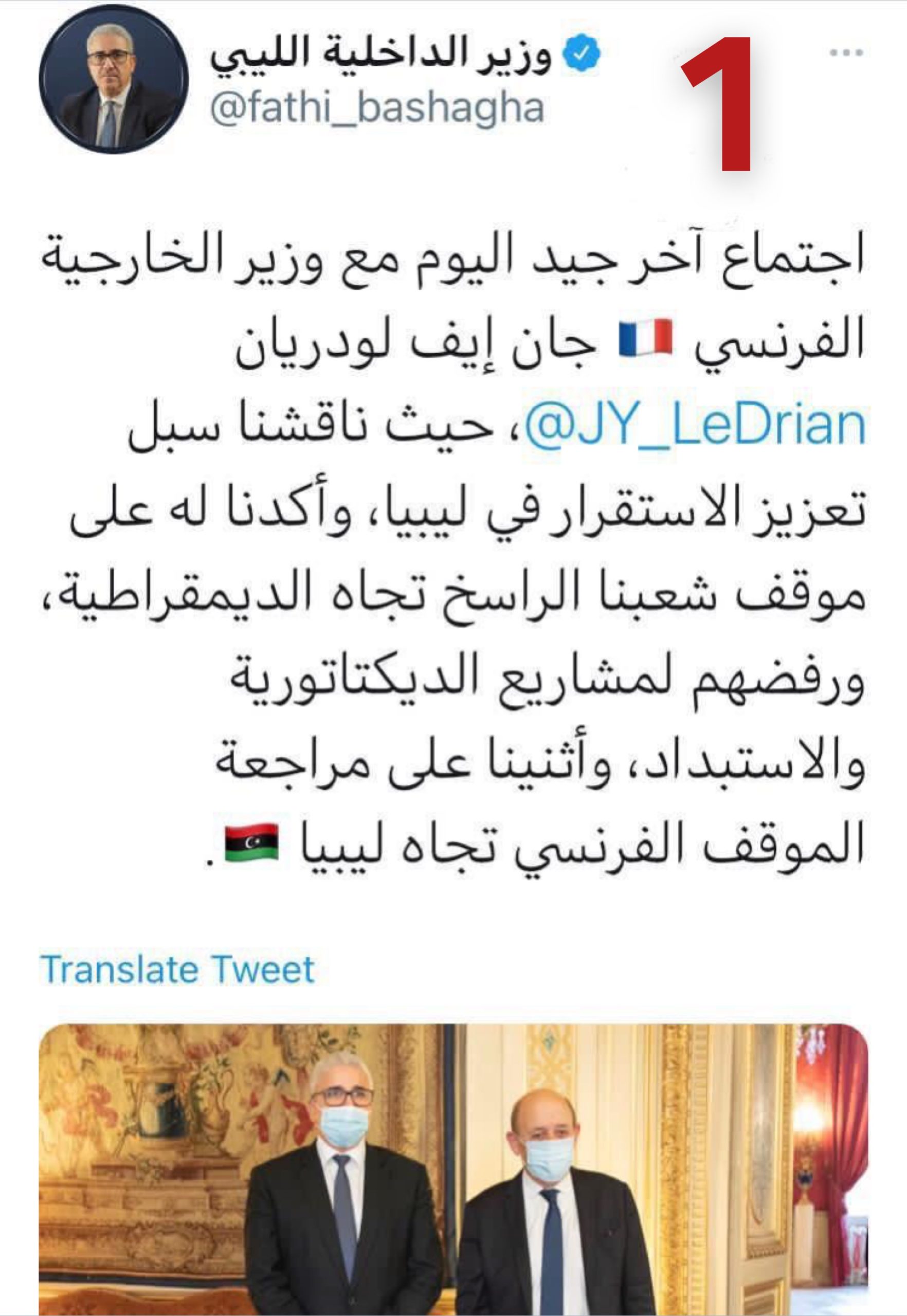 وكتب باشآغا في تغريدته المحذوفة : ” اجتماع جيد آخر اليوم مع وزير الخارجية جان لودريان حيث ناقشنا سبل سبل تعزيز الاستقرار في ليبيا وأكدنا له موقف شعبنا الراسخ تجاه الديمقراطية ورفض مشاريع الديكتاتورية والإستبداد وأثنينا على مراجعة الموقف الفرنسي تجاه ليبيا ” .
