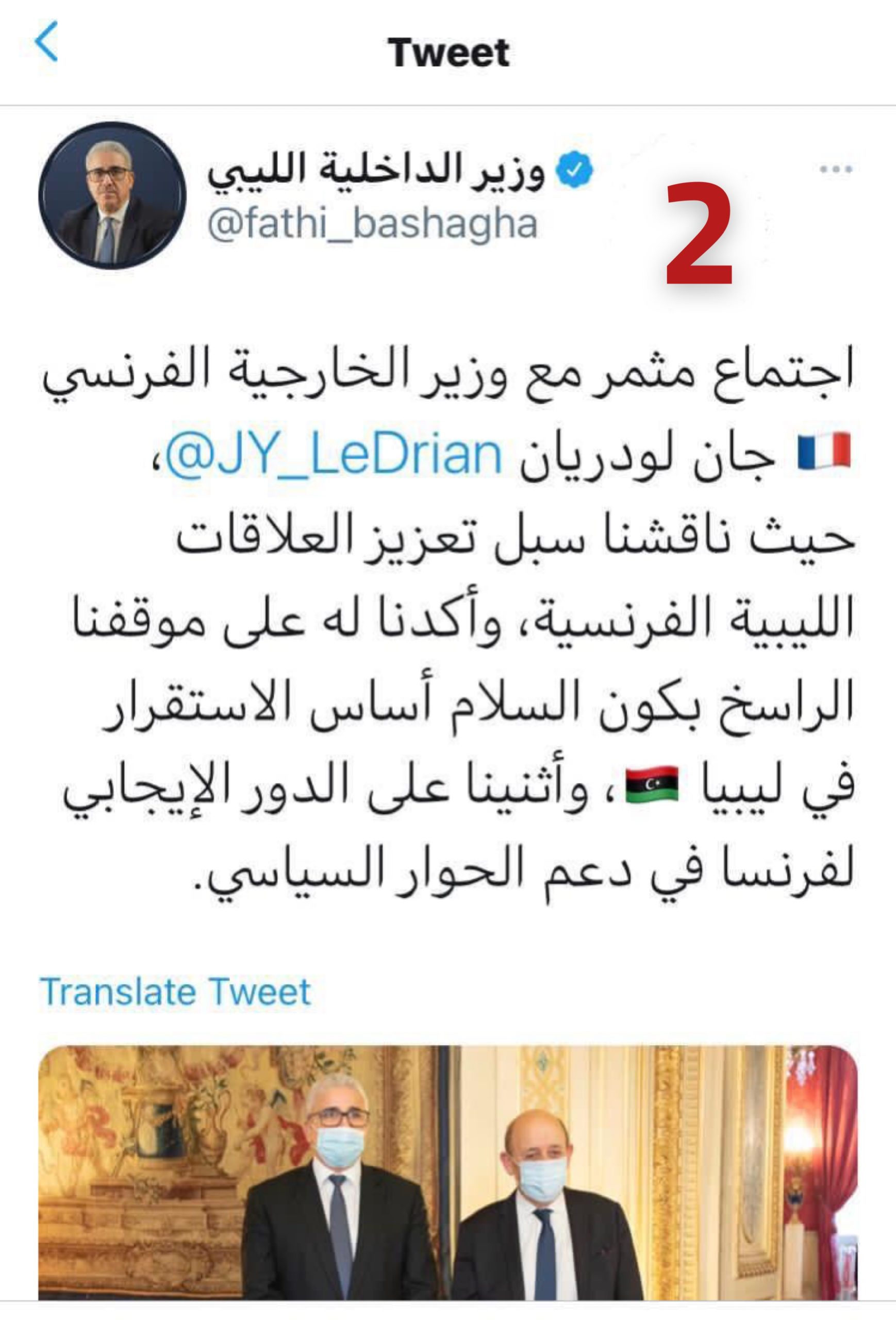 وكتب باشآغا في تغريدته المحذوفة : ” اجتماع جيد آخر اليوم مع وزير الخارجية جان لودريان حيث ناقشنا سبل سبل تعزيز الاستقرار في ليبيا وأكدنا له موقف شعبنا الراسخ تجاه الديمقراطية ورفض مشاريع الديكتاتورية والإستبداد وأثنينا على مراجعة الموقف الفرنسي تجاه ليبيا ” .