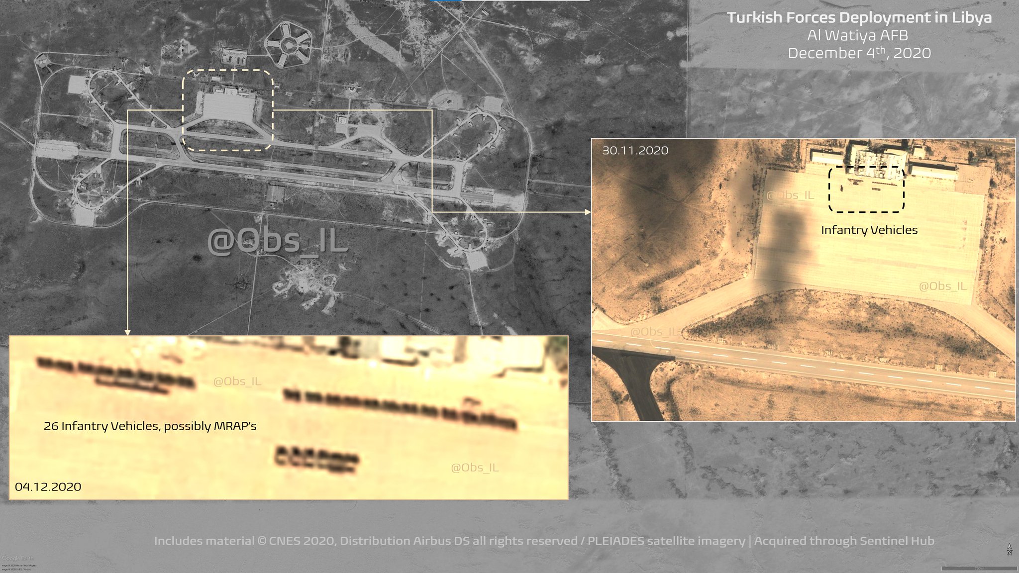 وشهدت الأيام الماضية رصد رحلات جوية مكثفة قام بها سلاح الجو التركي نحو غرب ليبيا عبر طائرات شحن عسكري ضخمة من طراز A400، بلغت قرابة 25 رحلة خلال الفترة مابين 28 نوفمبر و 4 ديسمبر.