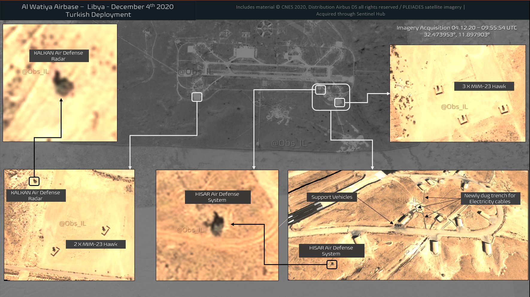 وبينت الصور بالأقمار الصناعية تعاظم حجم الإمدادات والوجود العسكري التركي خلال الفترة المذكورة بالأسبوع الماضي في قاعدة الوطية، وأظهرت وجود آليات ومعدات وأسلحة جديدة بينها منظومات دفاع جوي نوع “حصار وكالكان وهاوك”.